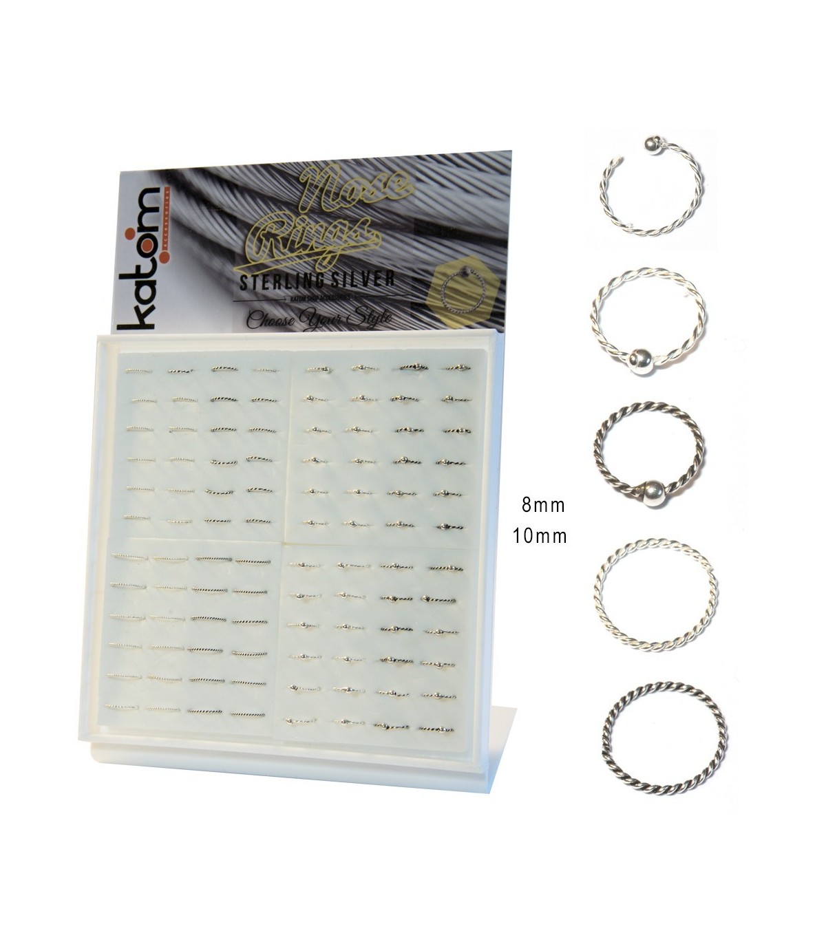 Expositor de piercing de nariz: aros de plata trenzada en dos tamaños, textura mate o textura brillante, con o sin bolitane dos tamaños 8 y 10 mm.