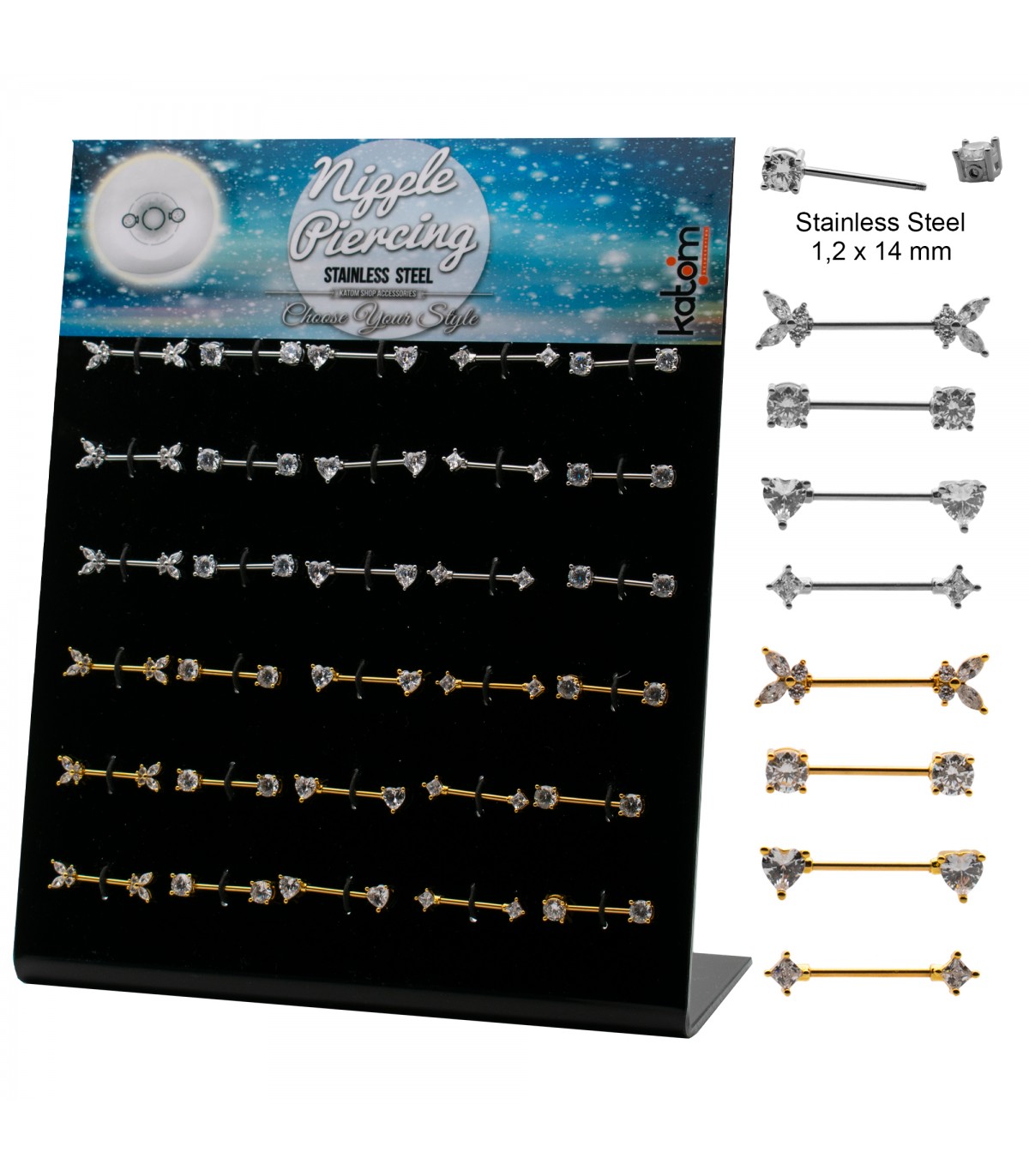 Expositor de piercing de pezón de acero quirúrgico con cristales a ambos extremos de la barra (1,2 mm de grosor por 14 mm de largo)