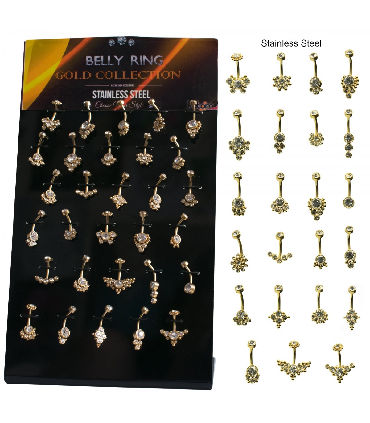 Expositor de piercing de ombligo navel con critales Swarovski, 9 modelos en acero y 9 modelos en negro.