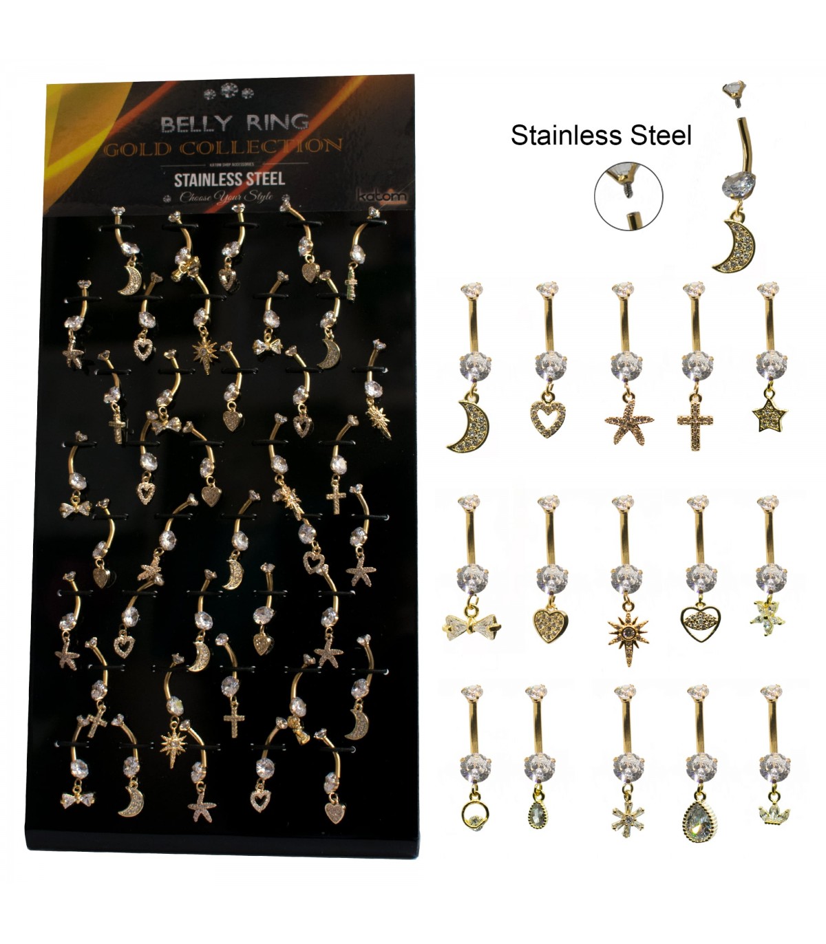 Expositor de piercing de ombligo de acero con colgante largo de fantasía, hasta 24 modelos diferentes.