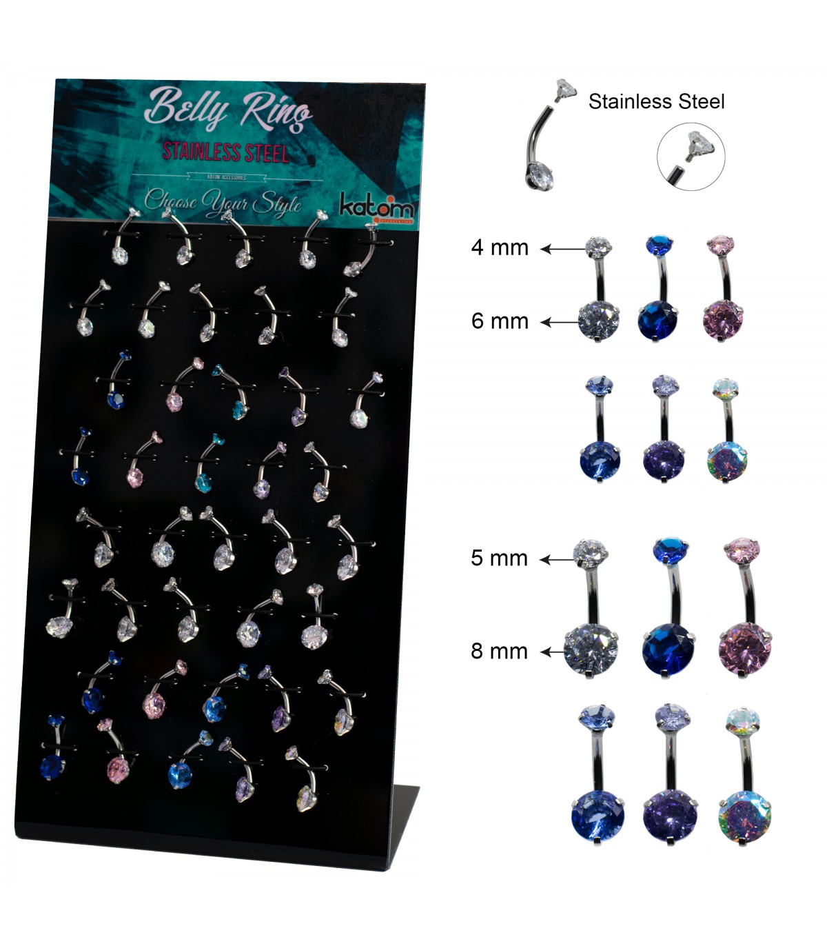 Expositor de piercing de ombligo de 9mm piedra swarovski en varios modelos. Expositor de mesa de regalo.