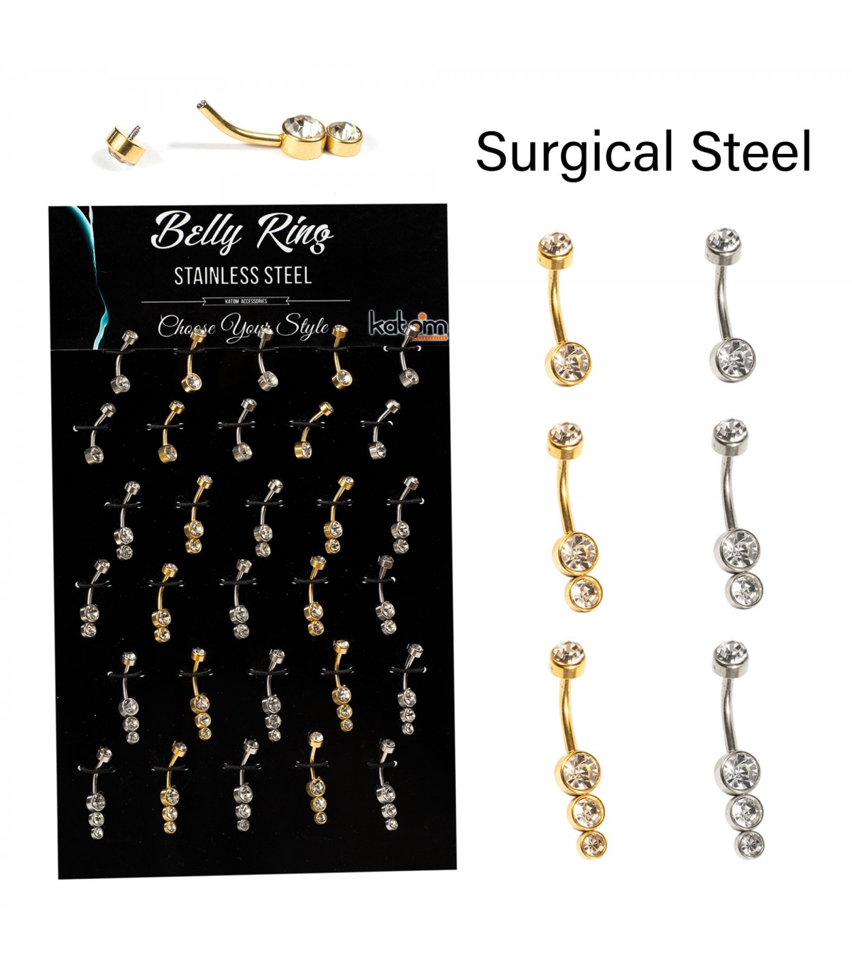 Expositor de piercing de ombligo con circonita arriba y 3 o 5 circonitas en linea horizontal abajo, en color acero o dorado.