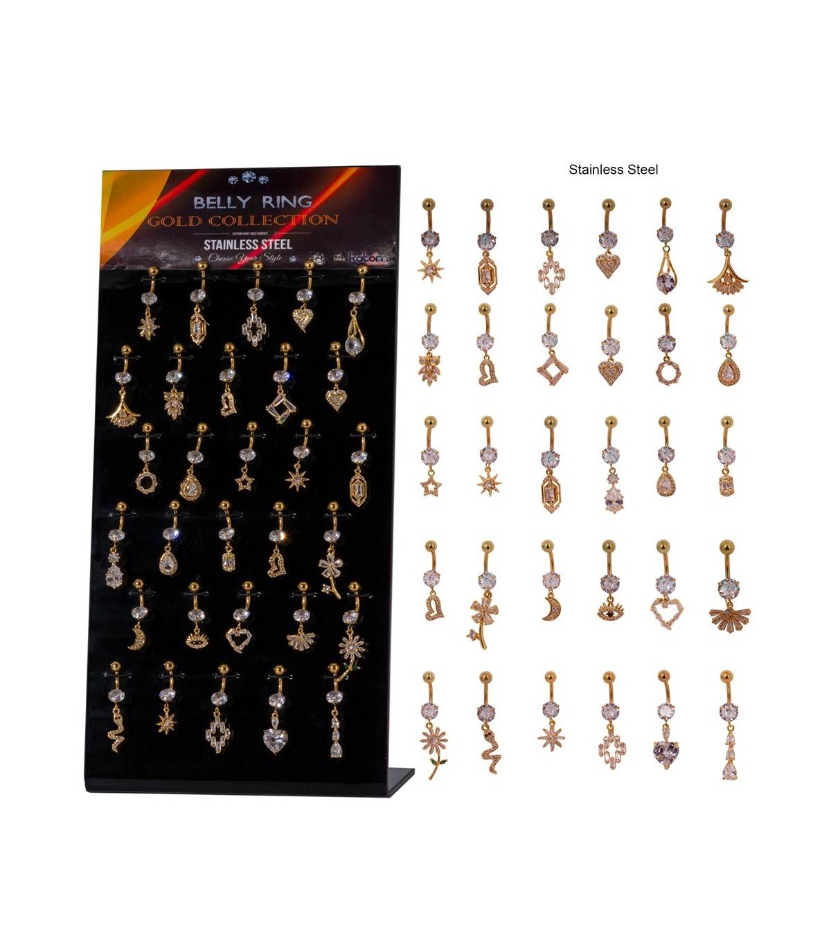 Expositor de piercing de ombligo de acero con colgante largo de fantasía, hasta 24 modelos diferentes.