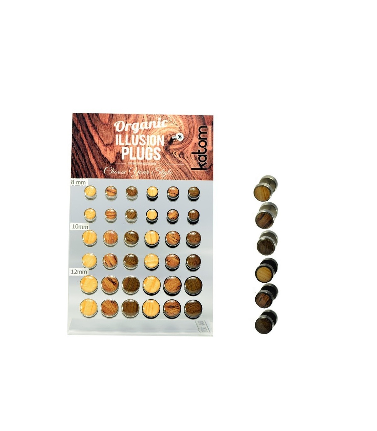 Expositor de falsas dilataciones en acero y madera. Con diferentes tamaños y tonos de madera.