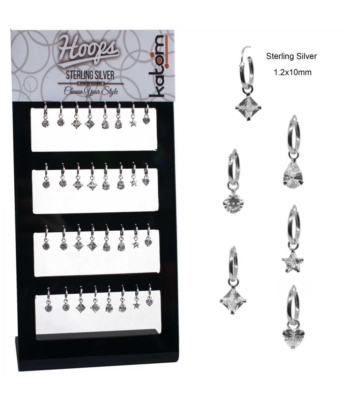 Expositor de aros de plata de 10 mm de diámetro y 1,2 mm de grosor con colgante en 8 motivos difrentes