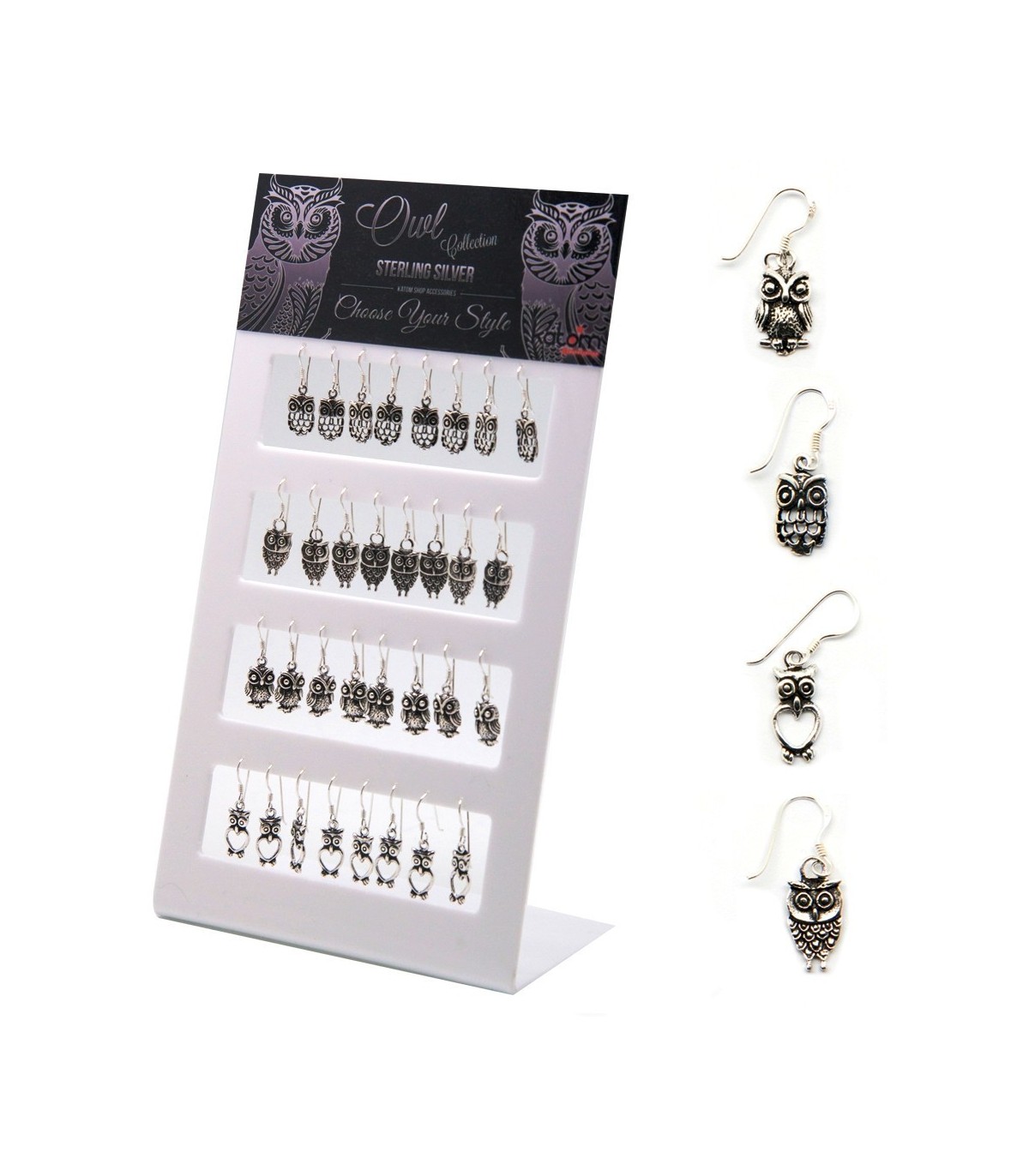 Expositor pendientes de plata de ley, colgantes, con diseños de buhos. 4 modelos diferentes. Actual y divertido.