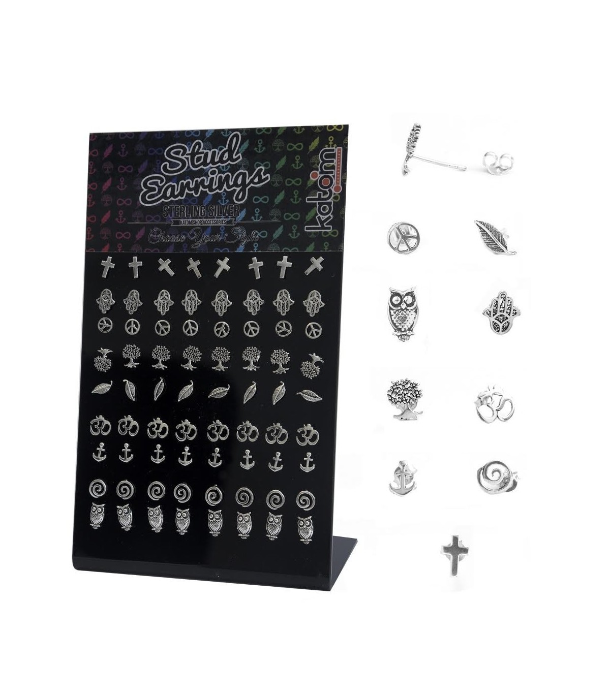 Expositor de pendientes de plata combinados con swarovskis con diseños juveniles y divertidos. Diferentes formas y modelos. Para todas las edades.9 modelos diferentes(72 unidades por expositor)