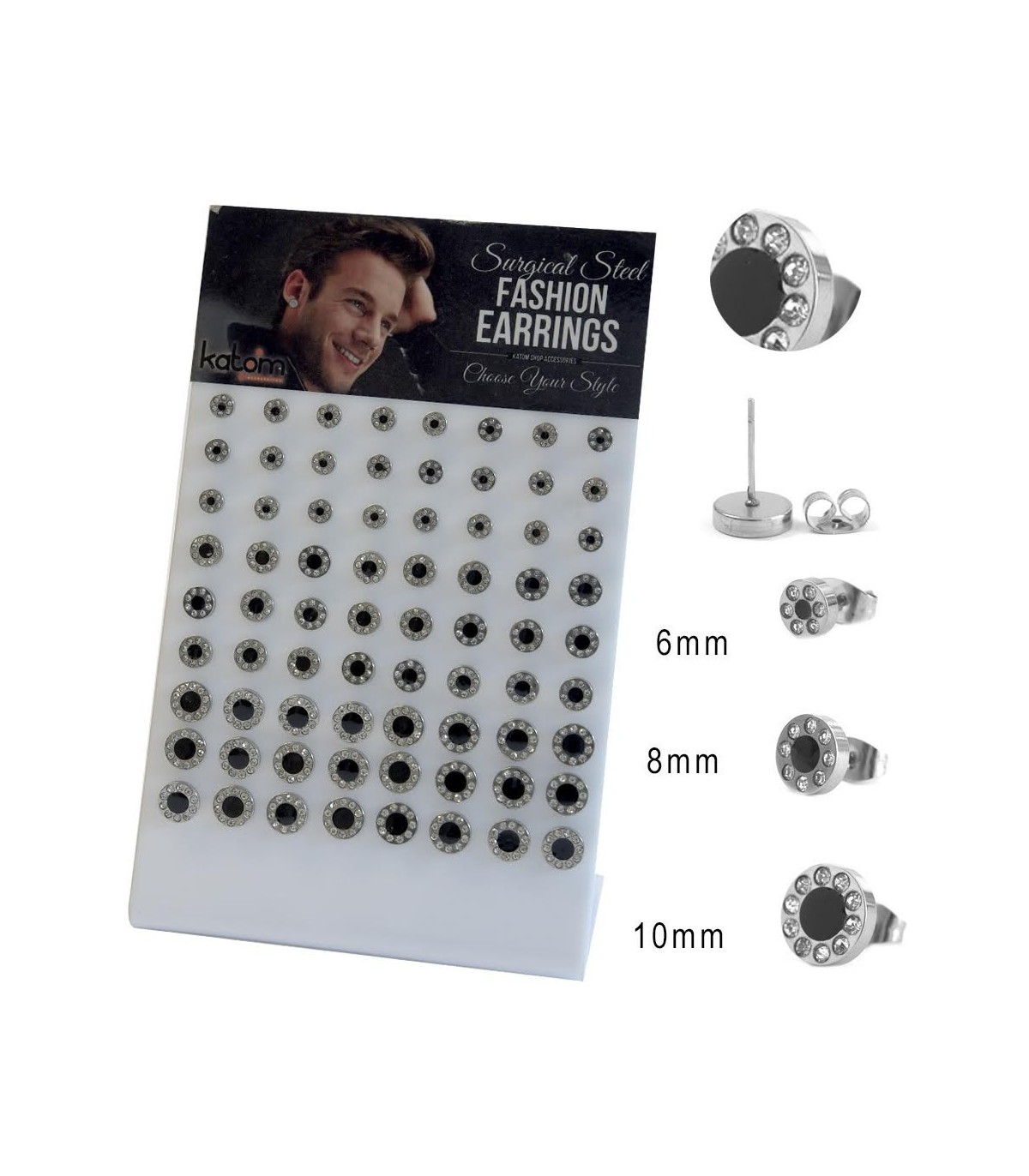 Expositor de pendientes de acero con centro negro con corona de circonitas blancas en tres tamaños 6mm, 8mm y 10 mm.