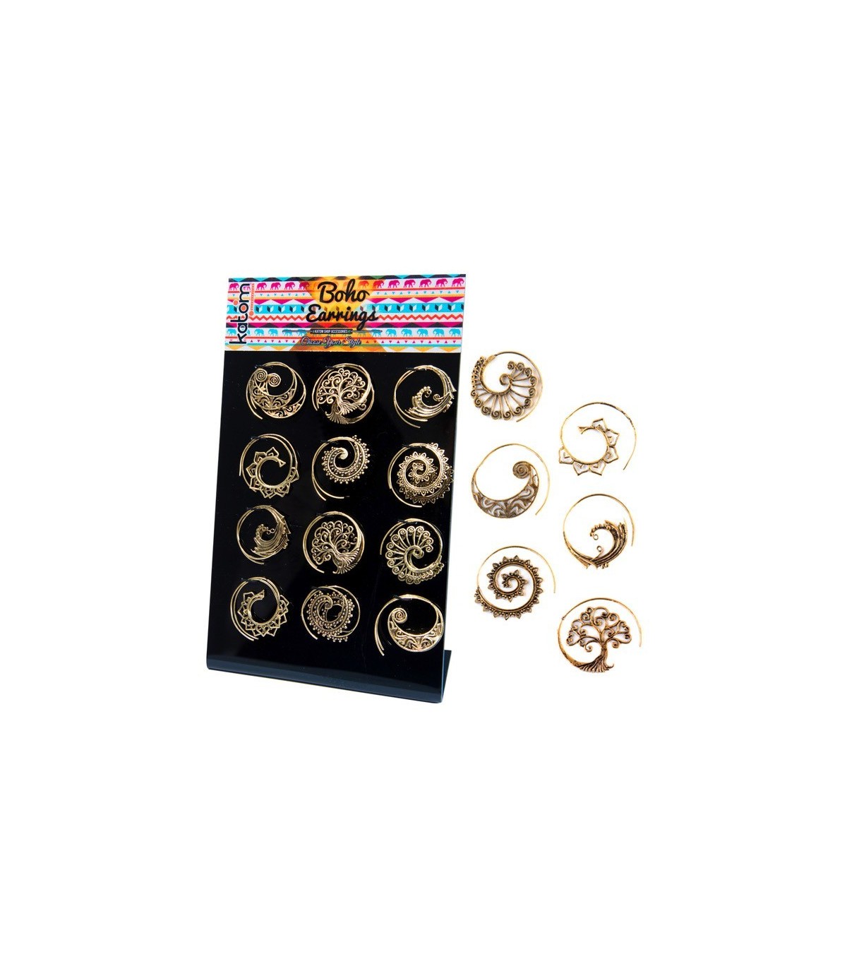 Expositor de pendientes Boho espiral dorados, 6 modelos.