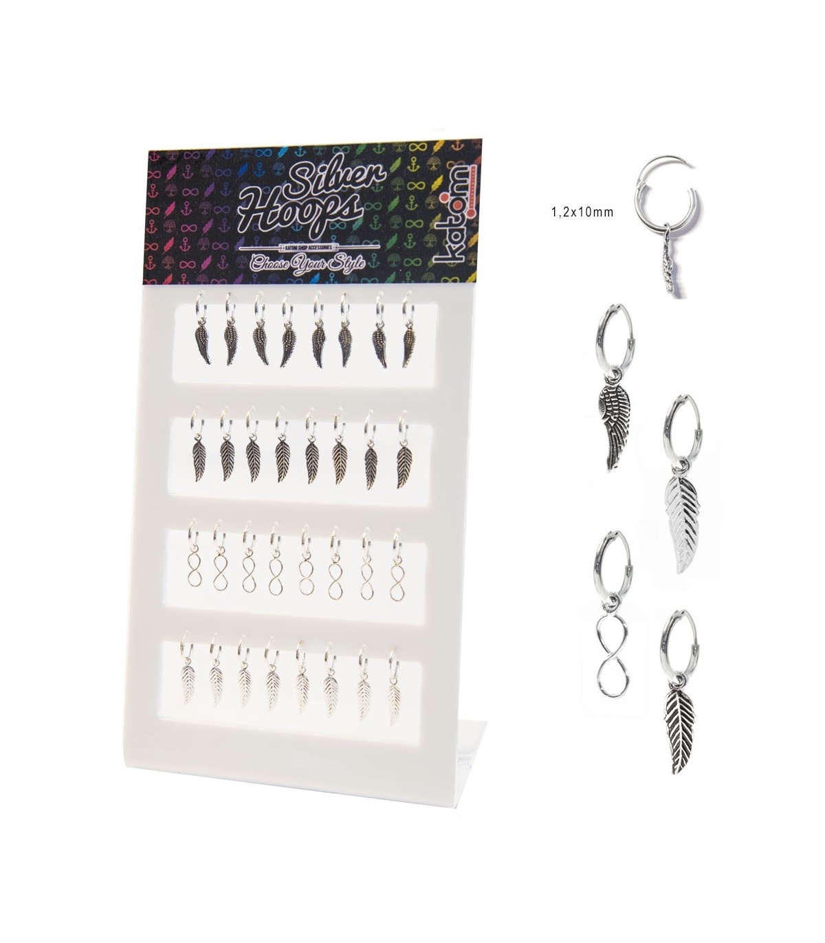 Expositor de aros de plata de 10 mm de diámetro y 1,2 mm de grosor con colgante, en 4 modelos: ala, pluma lisa, pluma rellena e infinito.