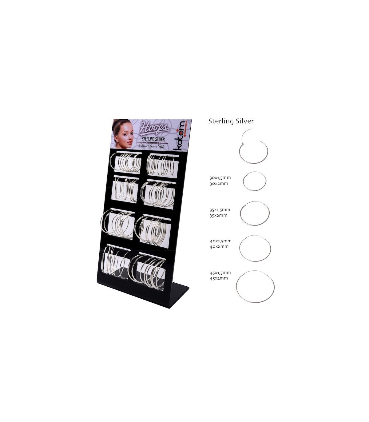 Expositor de aros lisos de plata grandes, diámetros 30, 35, 40, 45 mm y ancho de 1,5 o 2 mm