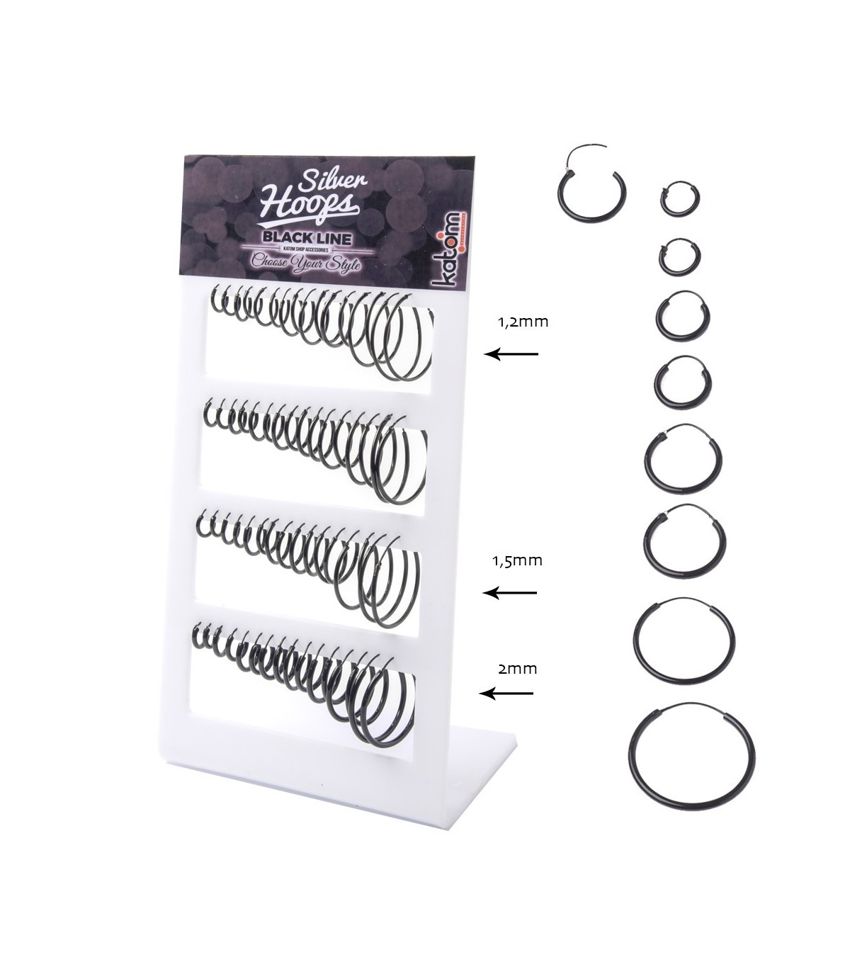 Expositor de aros de plata negros de 10, 12, 14, 16, 18, 20, 25 y 30 mm.