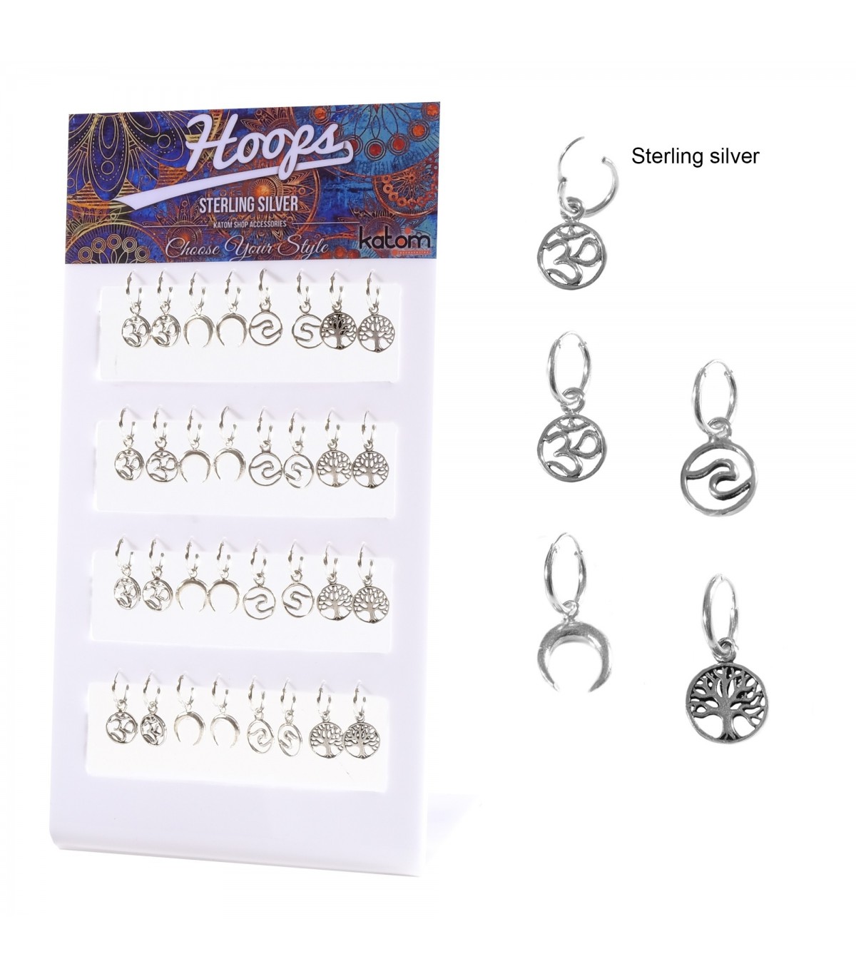 Expositor de aros de plata con colgantes circulares con símbolos étnicos; 4 modelos: luna invertida, om, águila y árbol de la vida.