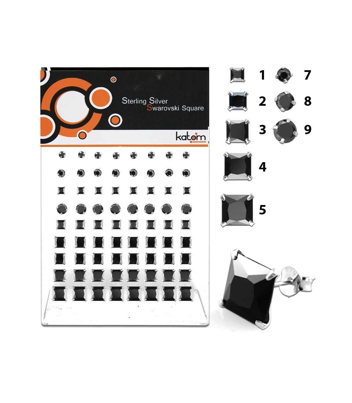 Expositor de 72 pendientes de plata color negro. De 3 hasta 8mm. Cuadrado y redondo para chico y chica.