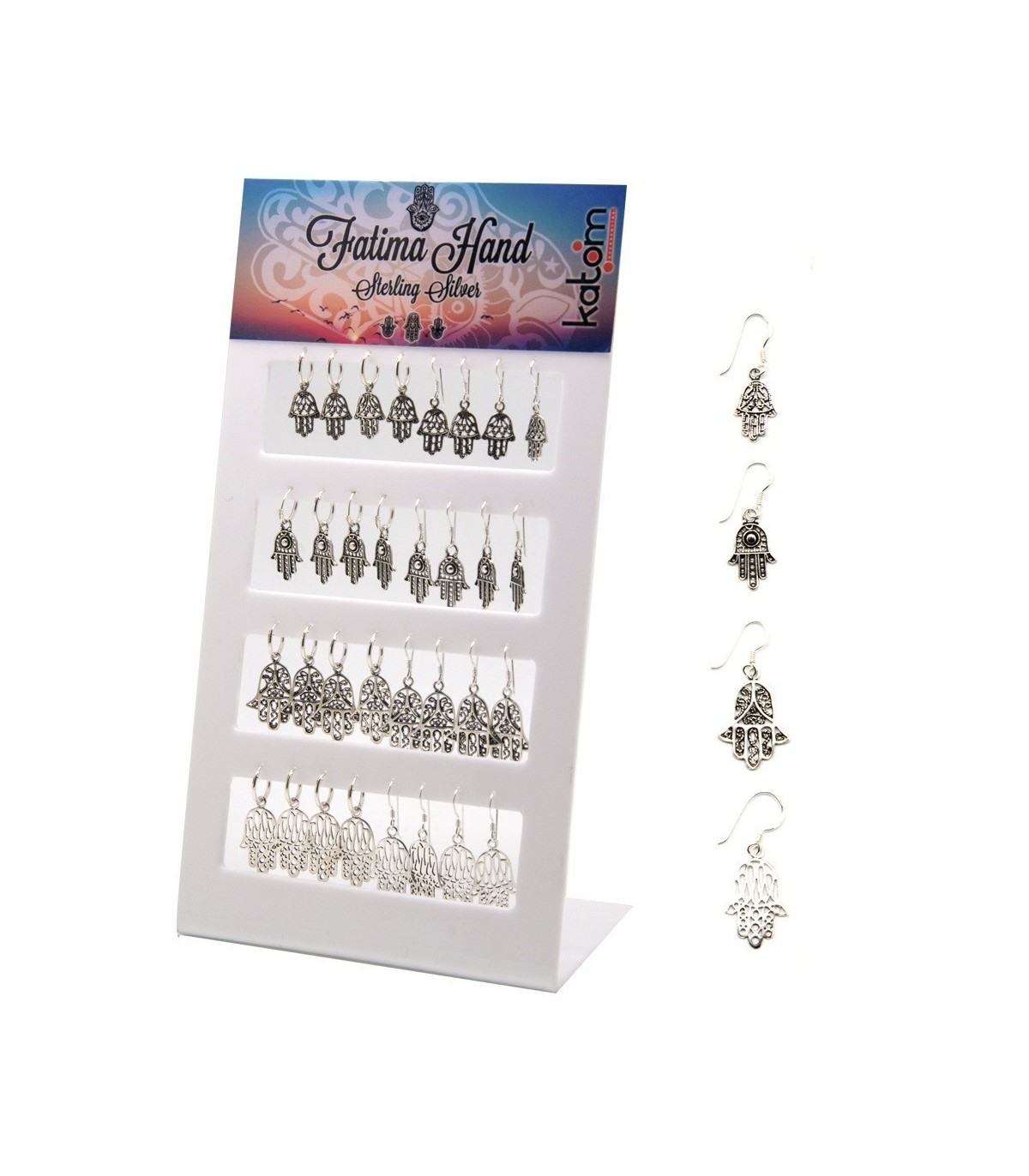 Expositor pendientes colgantes de plata de ley, con diseño de mano de Fatima. 4 modelos diferentes.