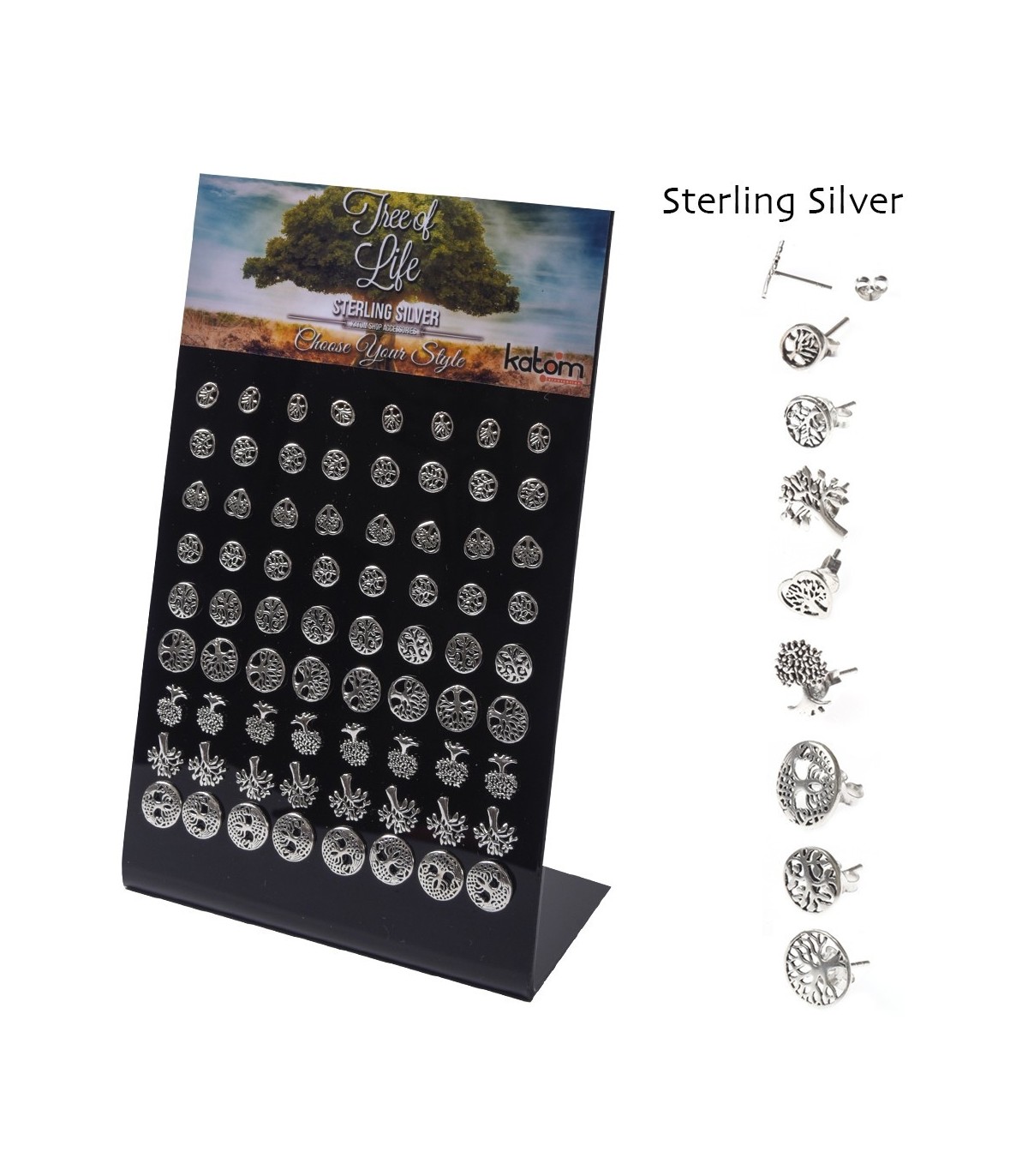 Expositor de pendientes de plata con 9 diseños diferentes del Árbol de la Vida.
