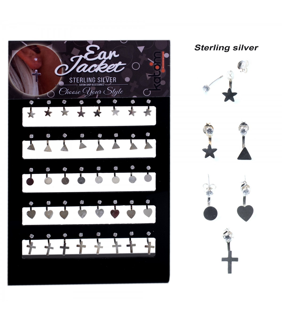 Expositor de pendientes de plata Ear Jacket compuestos de zirconita blanca 4mm y parte colgante en 5 motivos (círculo, estrella, cruz, triángulo, corazón).