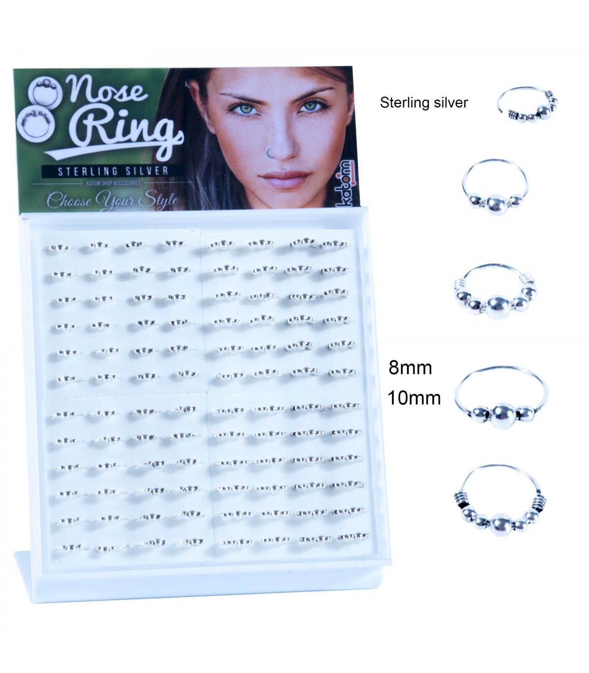 Expositor de falsos aros de plata con 2 bolas que se pueden usar como pendiente o como piercing de septum, nariz y/o de labio - tres colores: plata, negro y chapado en oro - dos tallas: 8mm y 10mm. (Número de piezas:...