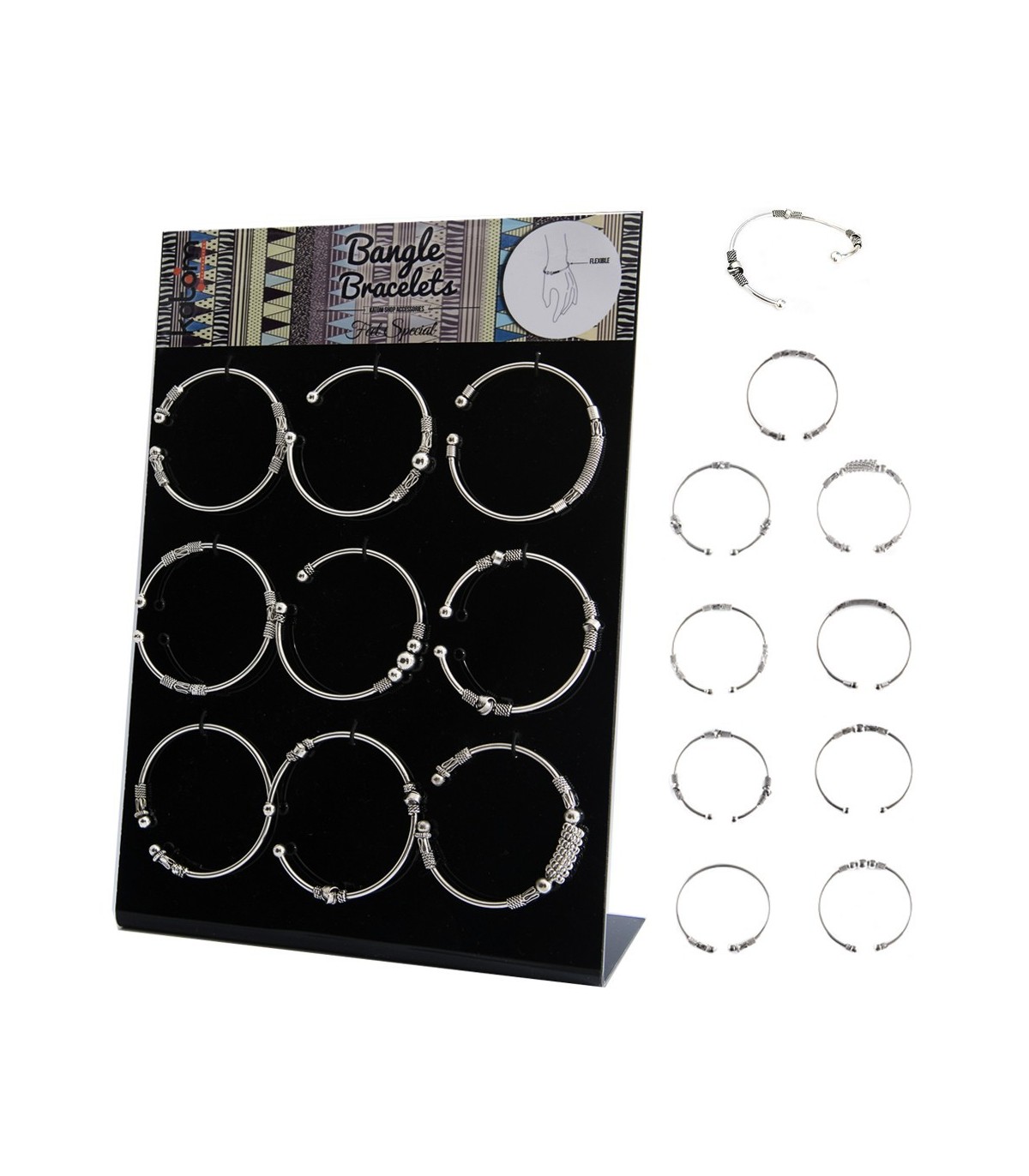Expositor de 15 modelos de pulseras estilo bali de apertura flexible.