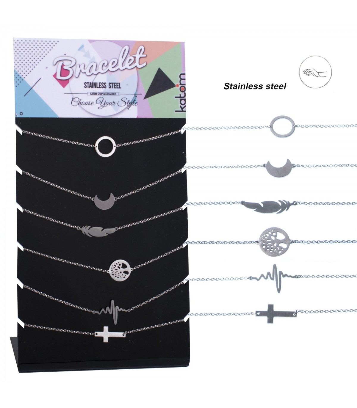 Expositor de pulseras con cadena de acero fina con motivos en la mitad de la misma. Hay 6 motivos diferentes.