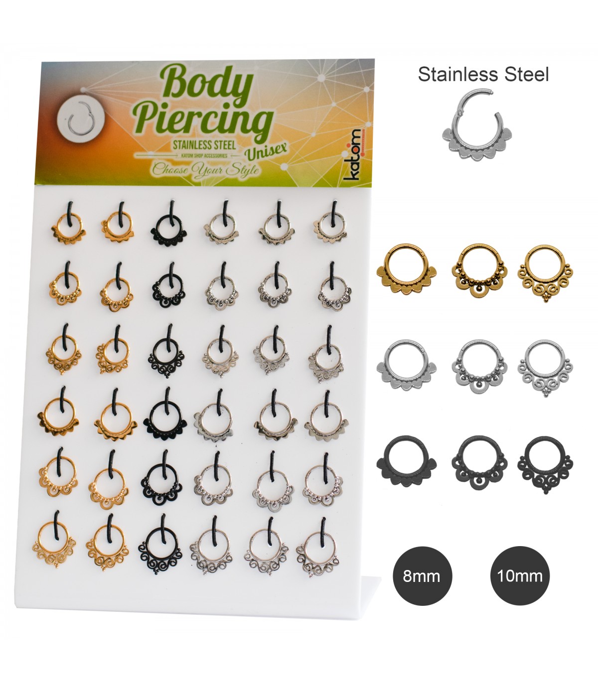 Expositor de aros de acero, con barra de 1,2 mm y diámetro de 8 mm, en tres colores (acero, negro y dorado) que puede usarse para el daith,Tragus, Helix, para la ceja, para el labio, para la nariz y como pendiente...