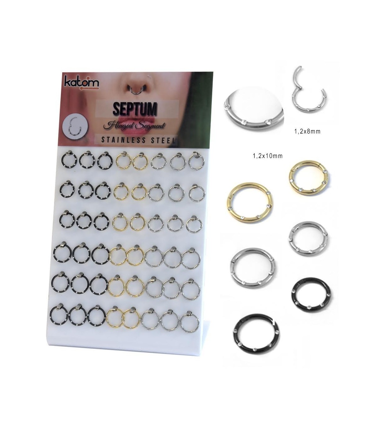 Expositor de piercing de acero, que al tener la barra de 1,2 mm puede usarse como Septum, Helix, Tragus y pendiente con cierre de bisagra clicable ( hinged segment )