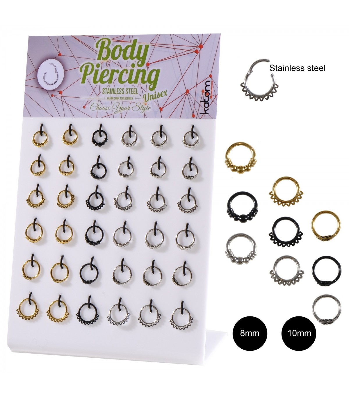 Expositor de Septum igual que daith y helix multijoya con cierre clicker bisagra, barra de 1,2 mm y diámetro de 8 mm en seis modelos: