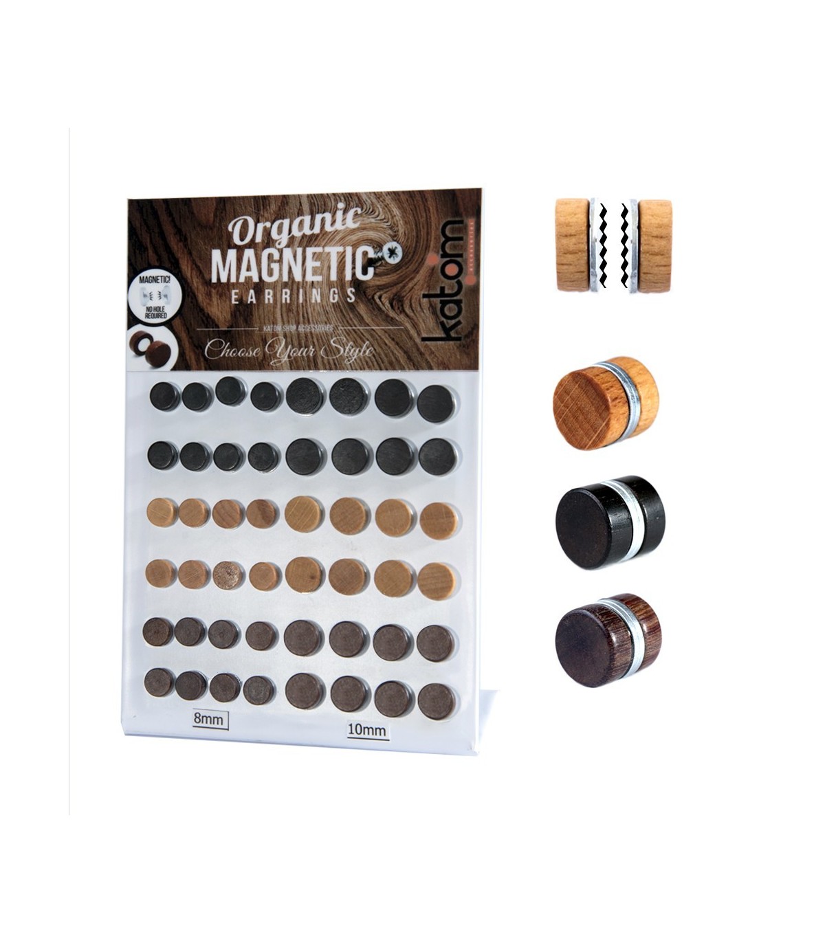 Expositor de falsas dilataciones magnéticas de madera en tres tonos y dos tamaños (8 mm y 10 mm)