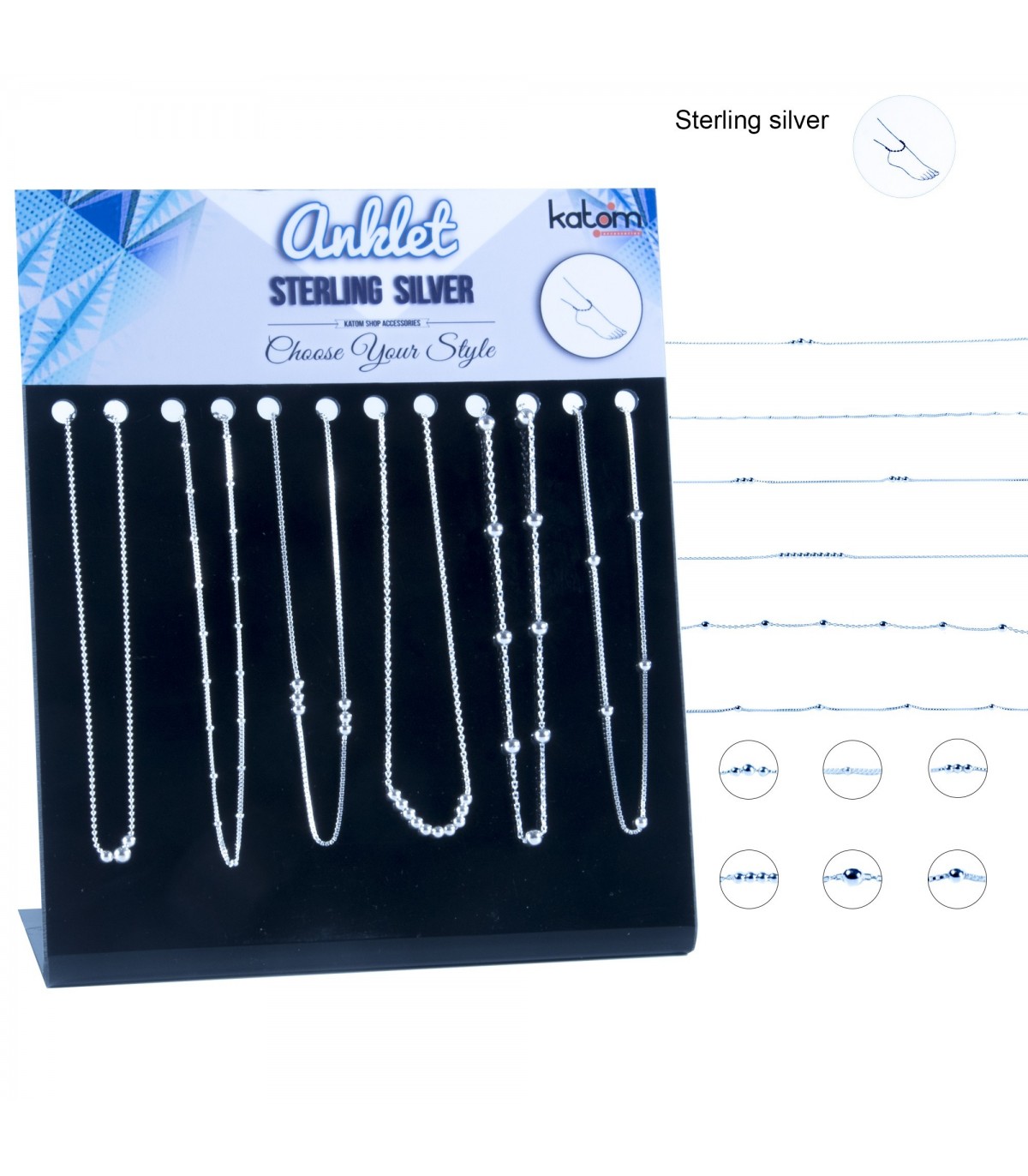 Ver más Compartir Tobilleras motivos de plata - ANK1225 Expositor de tobilleras de plata de ley con pequeños elementos colgando, varios modelos. (Número de piezas: 24) Ver más Vista rápida Compartir