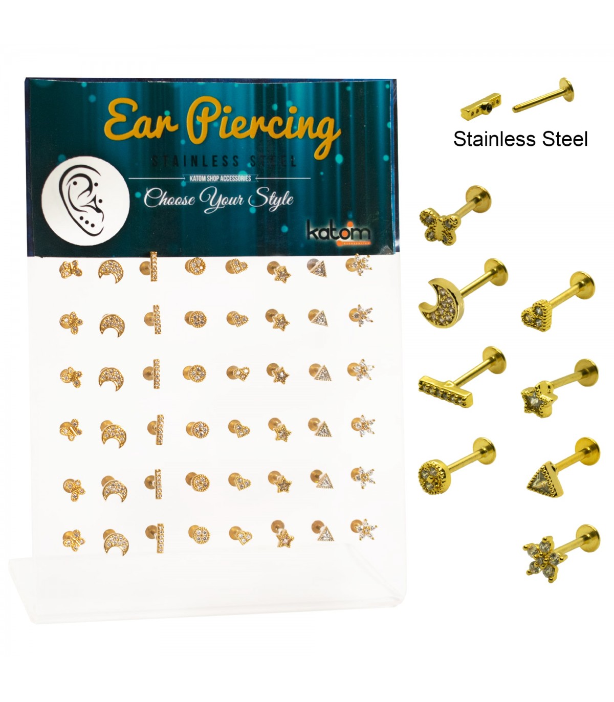Expositor de piercing para Helix/Tragus de acero dorado, varios motivos con cristal