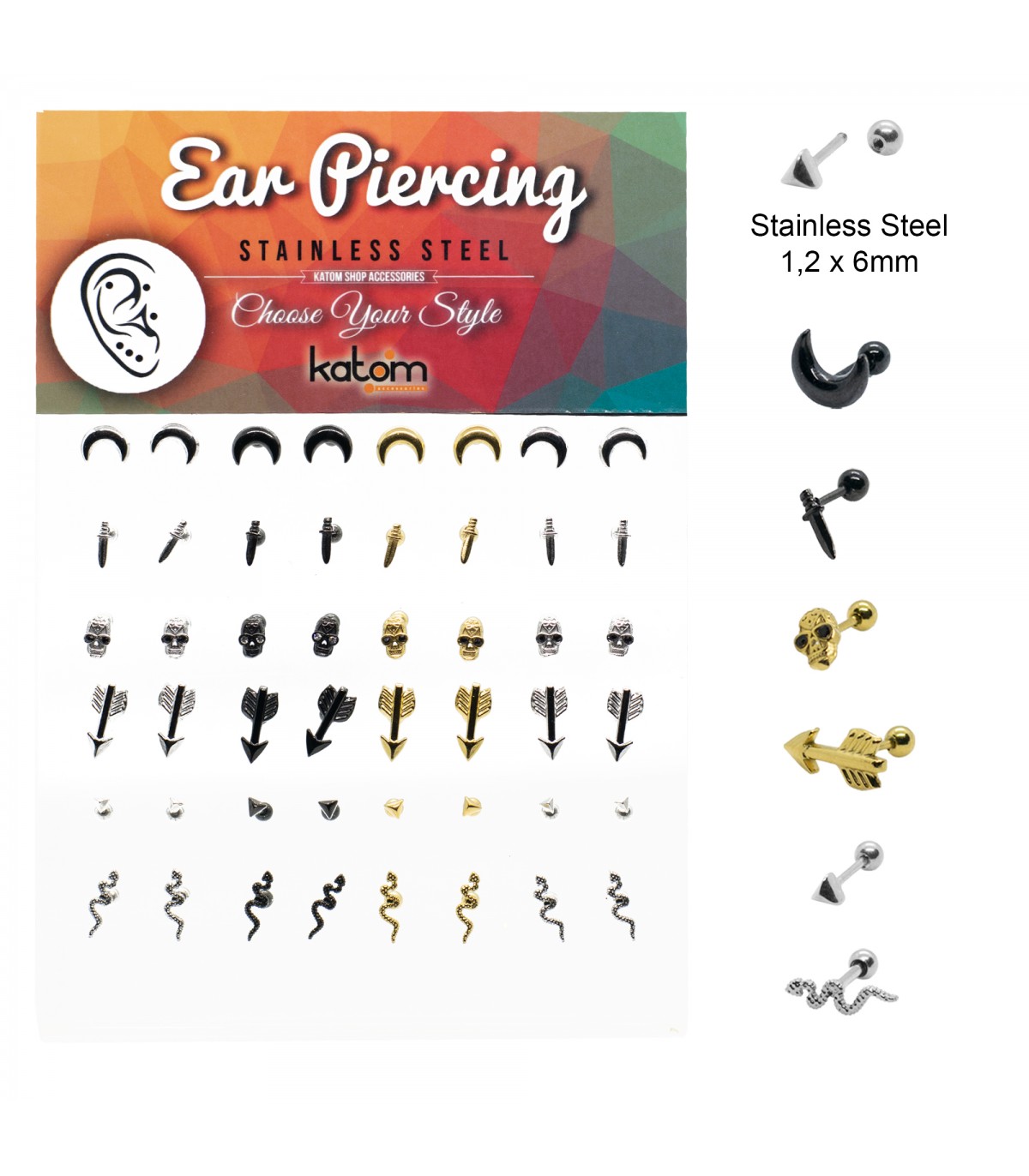 Expositor de piercing de acero que puede usarse como pendiente, Tragus o Helix con barra de 1,20 mm por 6 mm de largo con 8 motivos diferentes muy comercial.