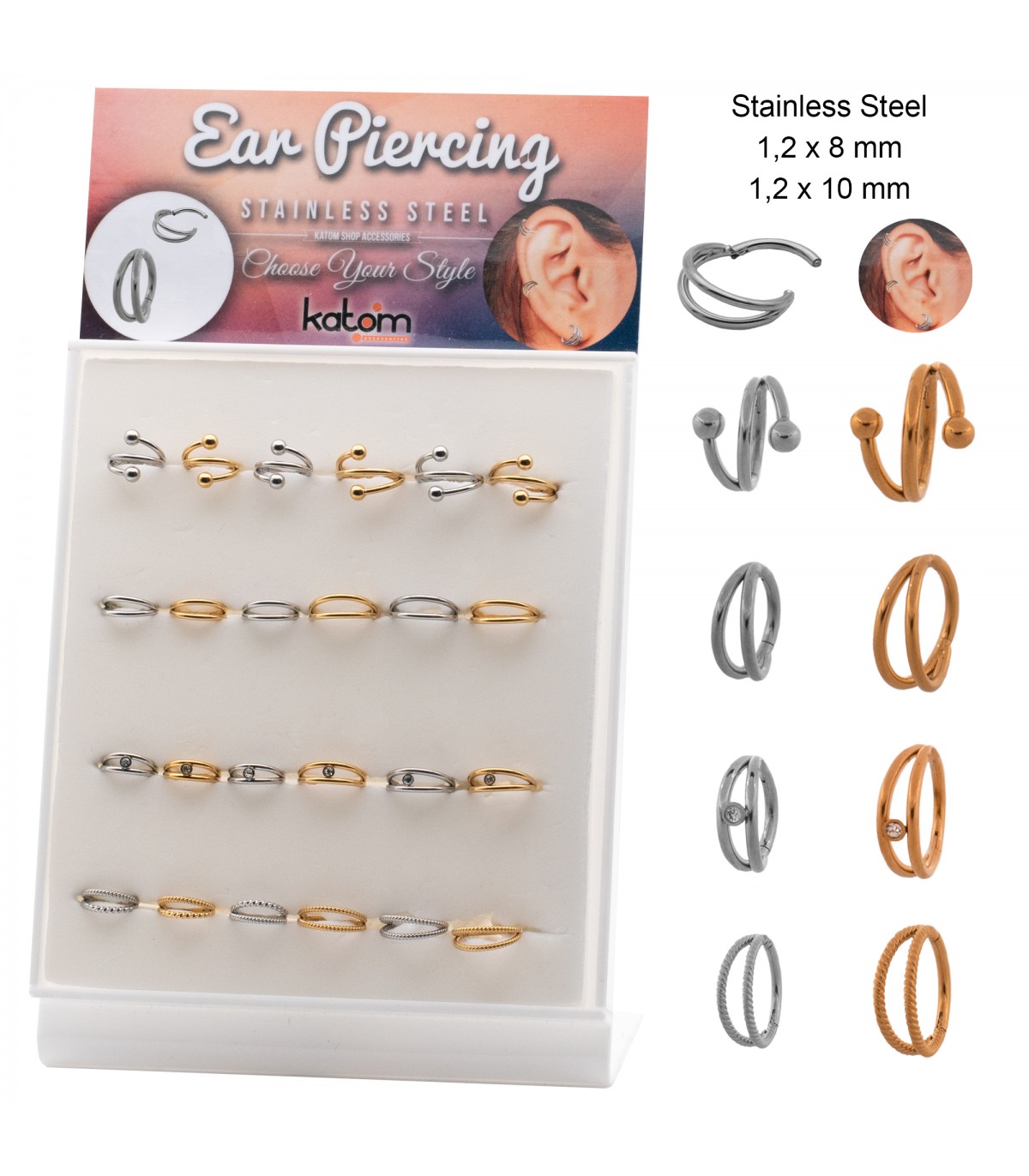 Expositor de Hélix/Tragus de acero, en tres colores plateado, dorado y negro. También puede usarse como pendiente.