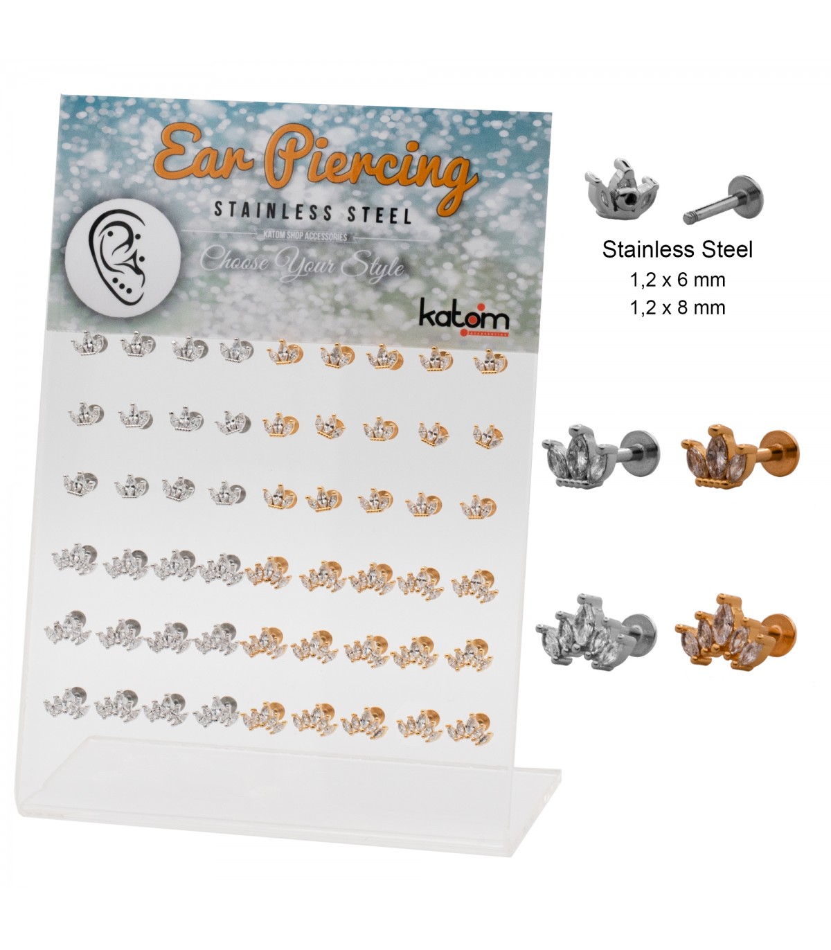 Expositor de piercing para Hélix/Tragus de acero que también puede usarse como pendiente, con circonitas, 15 modelos, con barras de 6 y 8 mm.