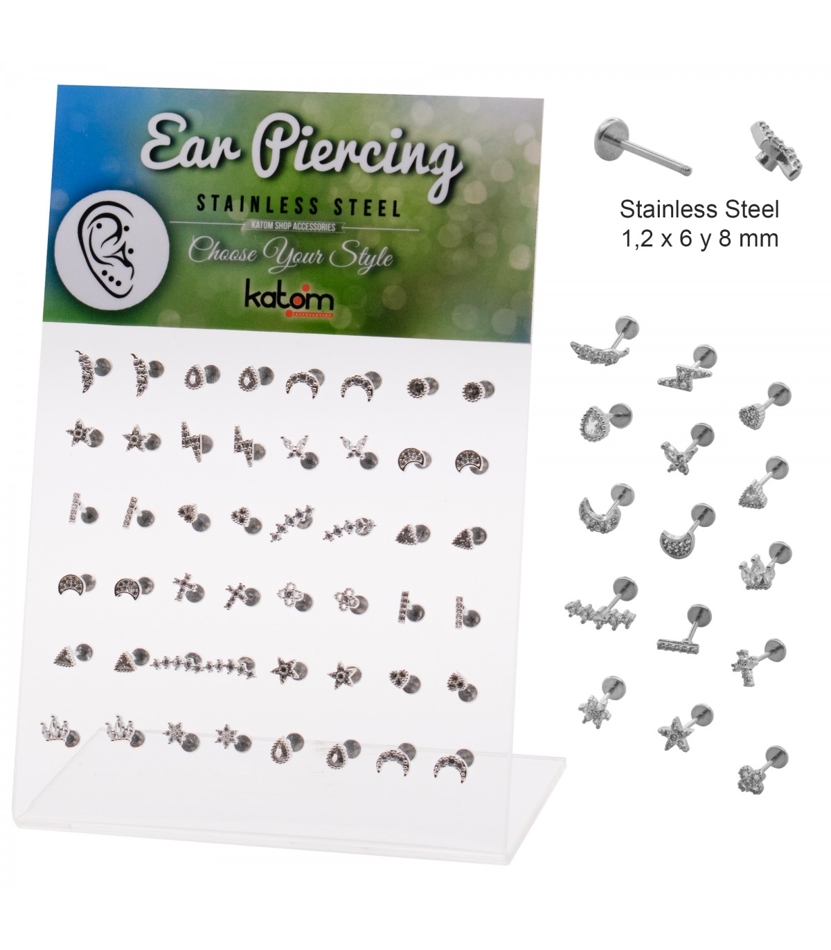 Expositor de piercing en acero para Helix y Tragus que también se puede usar como pendiente, con barra de 1,20mm por 6 mm de largo con 8 motivos diferentes muy comerciales, en tres colores: acero, dorado y negro....