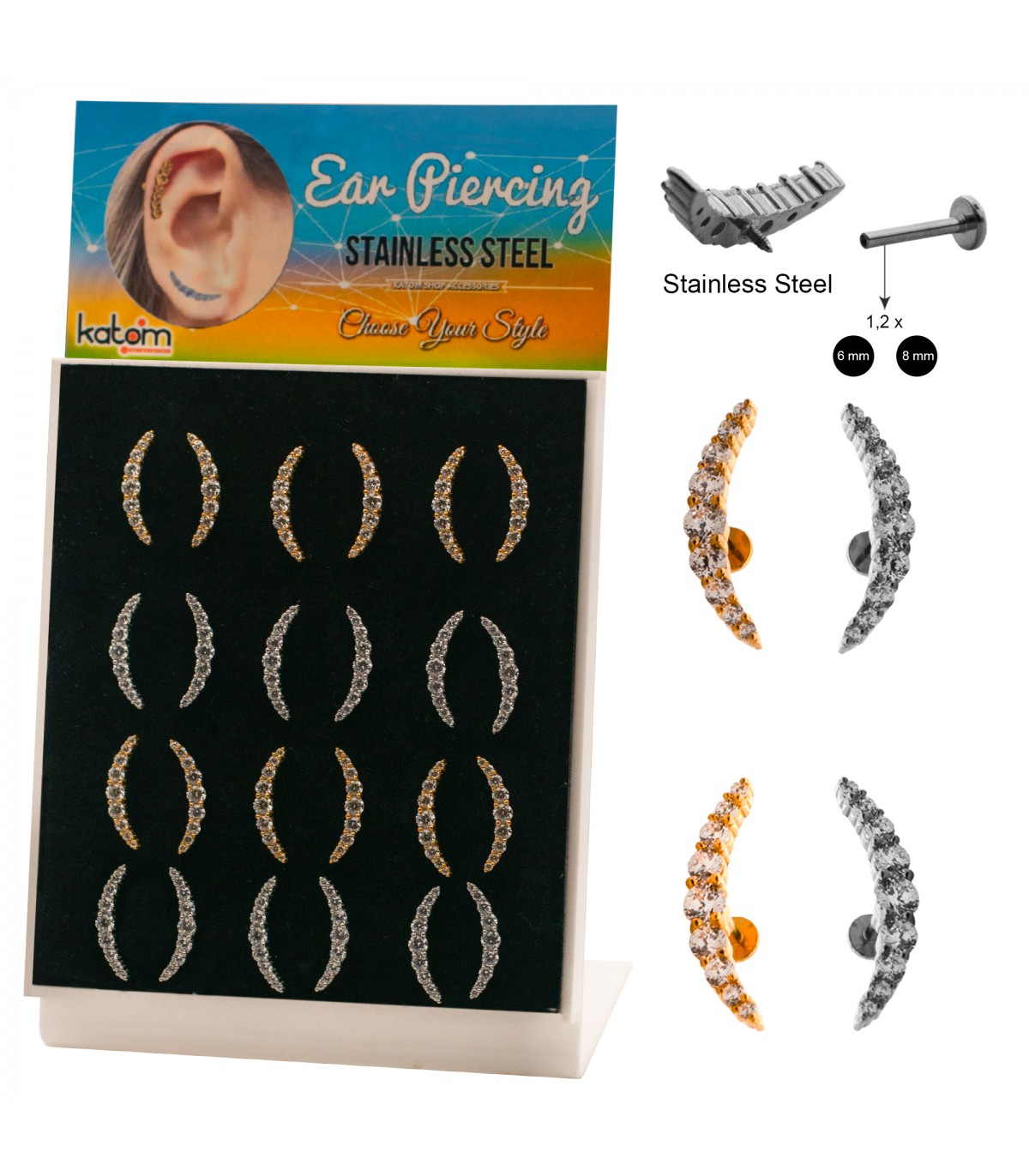 Expositor de Helix, Tragus o pendientes de acero con barra de 1,2 mm, 6 modelos diferentes con circonitas blancas.