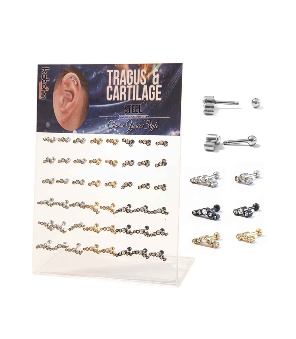 Expositor piercing para Hélix/Tragus o pendiente de acero, en tres colores plateado, dorado y negro.