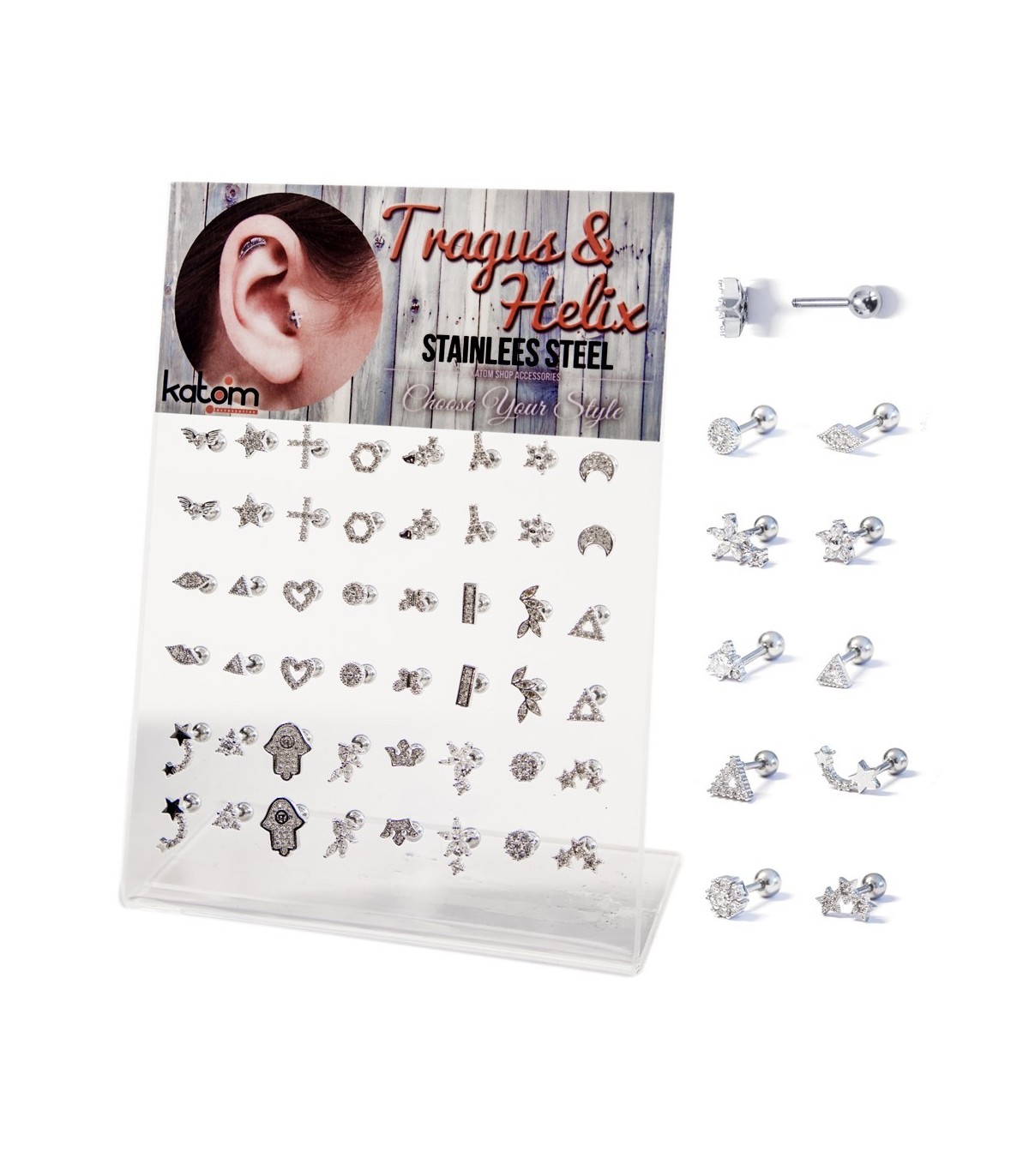 Expositor de piercing para Hélix/Tragus de acero que también puede usarse como pendiente, con circonitas, 15 modelos, con barras de 6 y 8 mm.