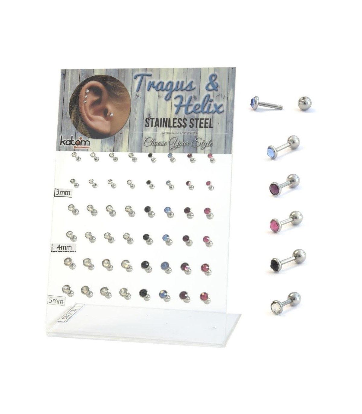 Expositor de piercing para Hélix/Tragus en acero con piedra circonita en 5 colores: celeste, granate, fucxia, negro y blanco, en tres tamaños: 3mm, 4mm y 5mm.
