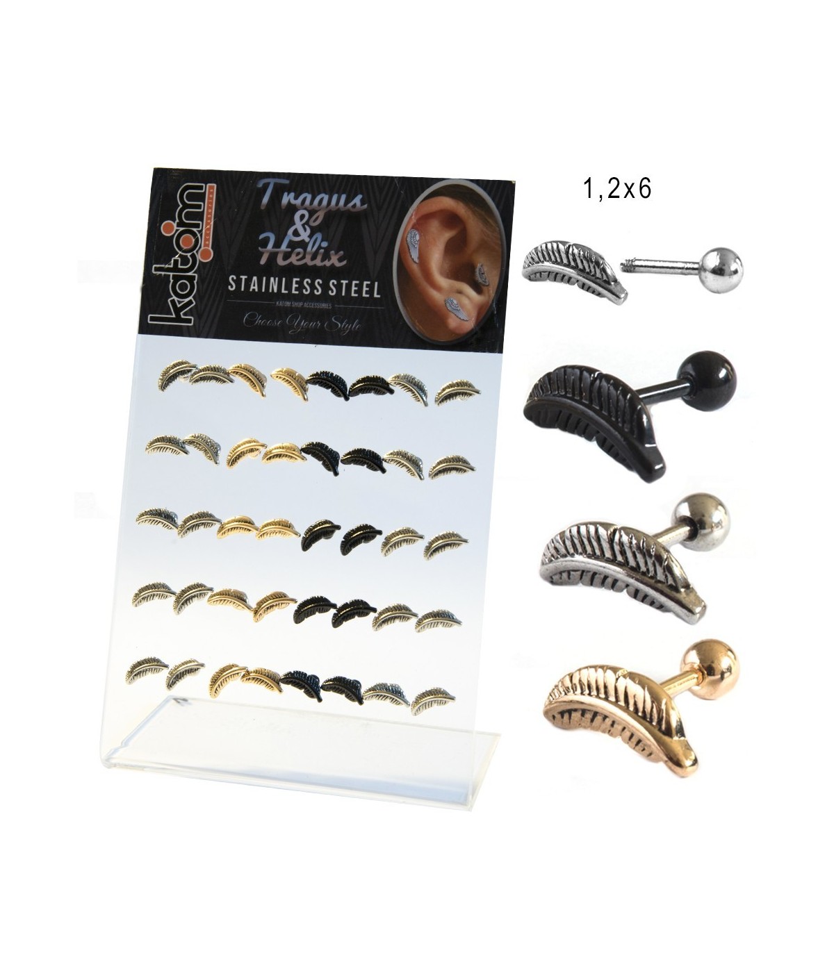 Expositor de piercing para Helix y/o Tragus con ala horizontal, en colores acero, negro y dorado.