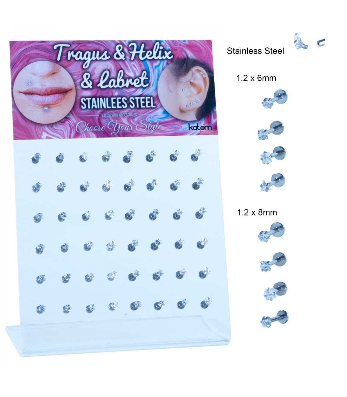 Expositor de piercing de acero que puede usarse como pendiente, Tragus o Helix con barra de 1,20 mm por 6 mm de largo con 8 motivos diferentes muy comercial.