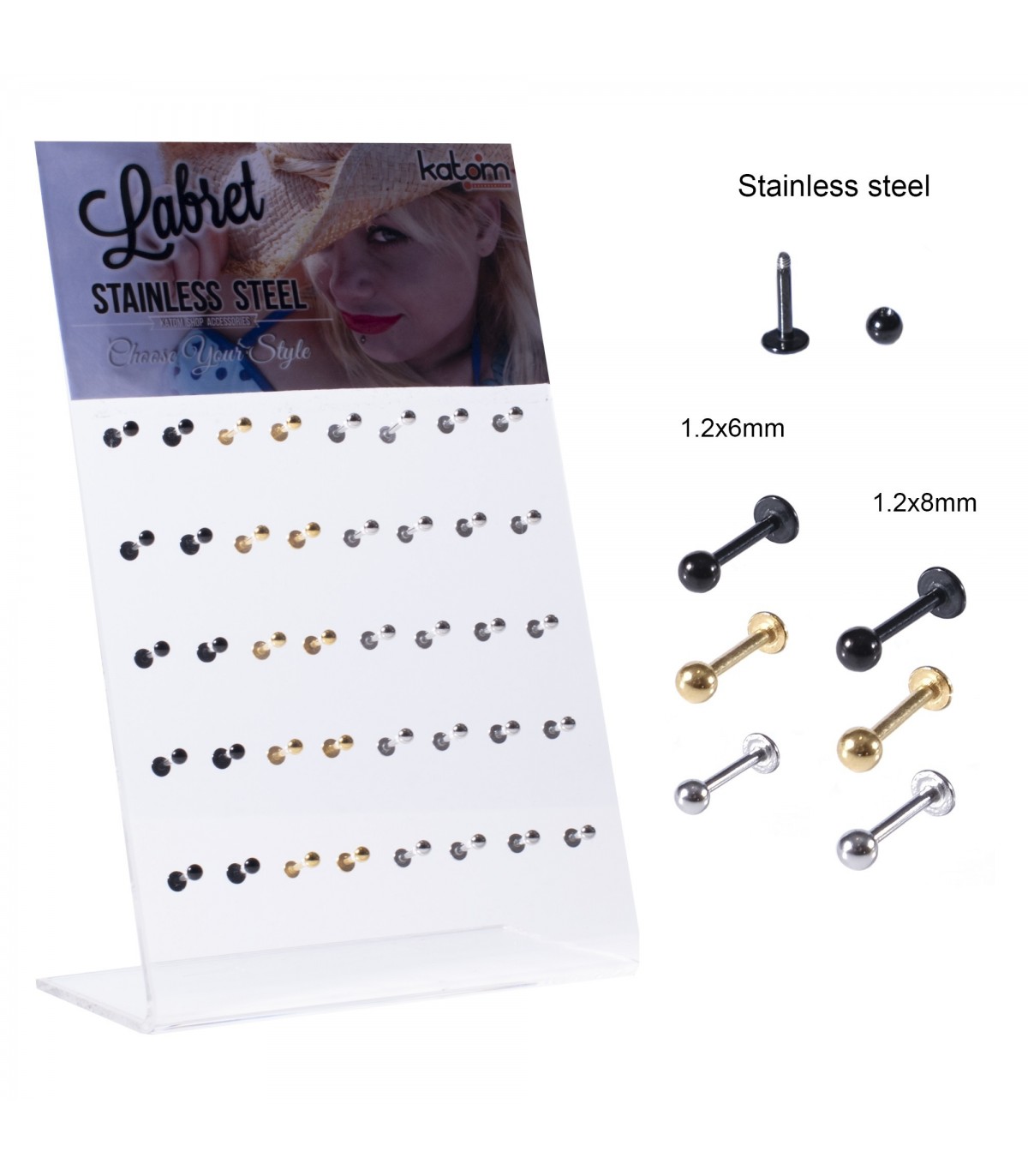 Expositor de body piercing de acero (Septum, helix, Tragus, Daith, labio, ceja o pendiente) de varios motivos - bolitas, piedra y pincho.- Dos tamaños: 8mm y 10mm- Tres colores: acero, dorado y negro(Número de piezas:...