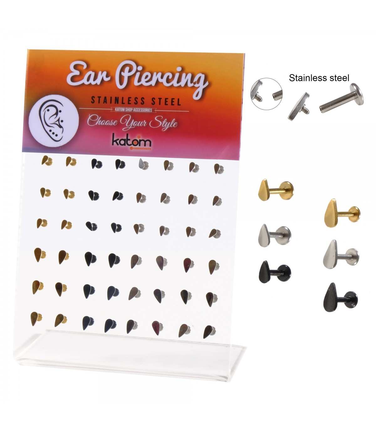 Expositor de piercing en acero para Helix y Tragus que también se puede usar como pendiente, con barra de 1,20mm por 6 mm de largo con 8 motivos diferentes muy comerciales, en tres colores: acero, dorado y negro....