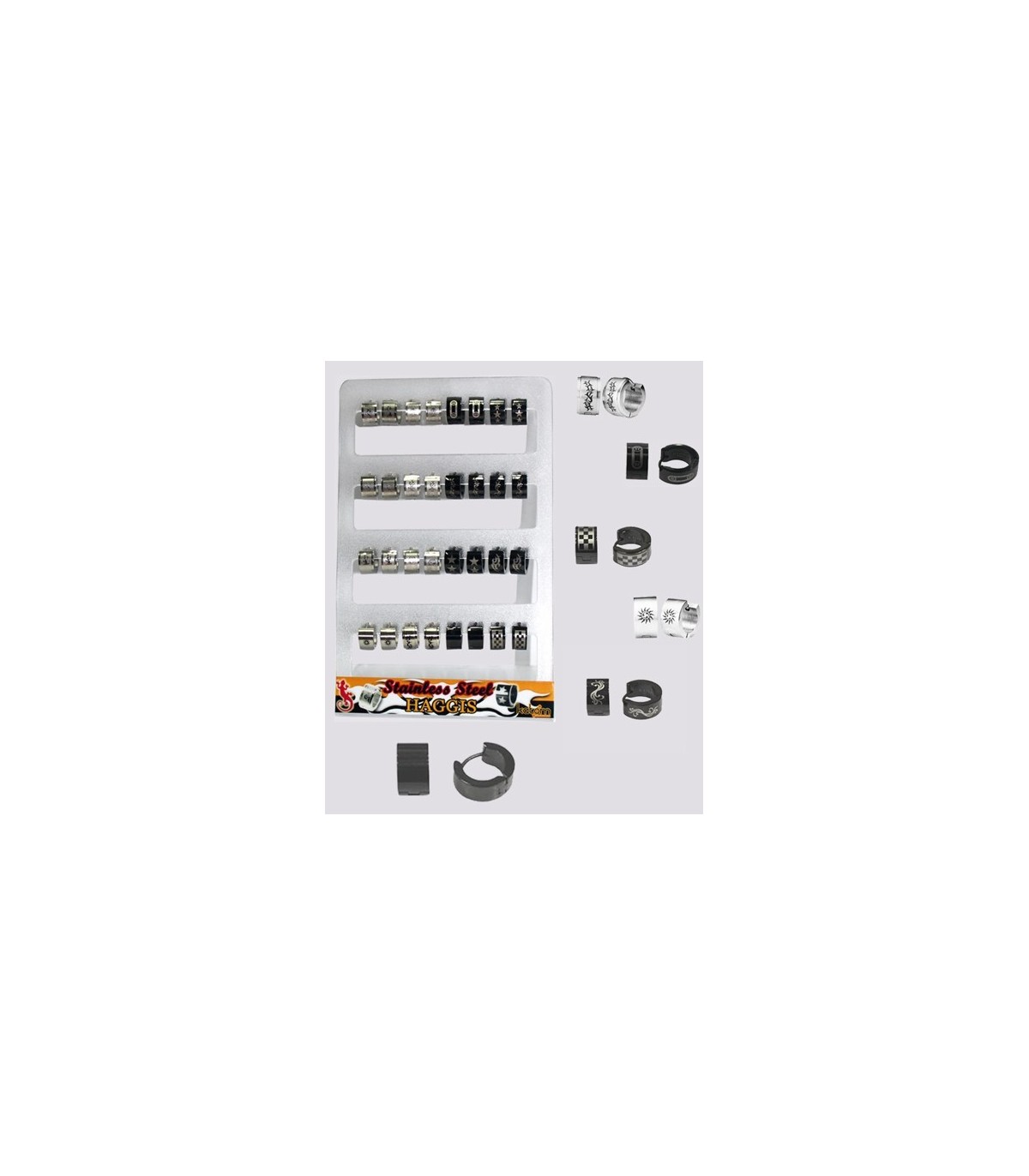 Exposant anneaux en acier chirurgical. Combiné en émaillé noir et l'acier. Avec 4 modèles différents.