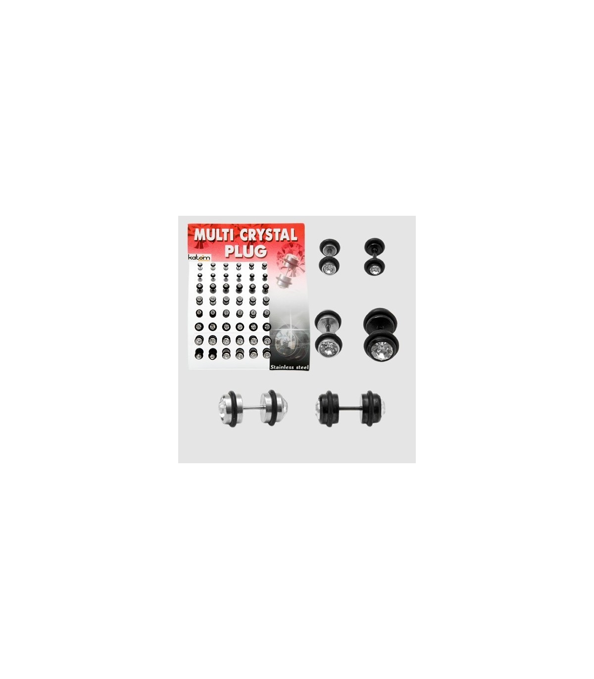 Présentoir de faux piercing plug en acier lisse; couleurs acier et noir; trois tailles 6, 8, 10 mm.
