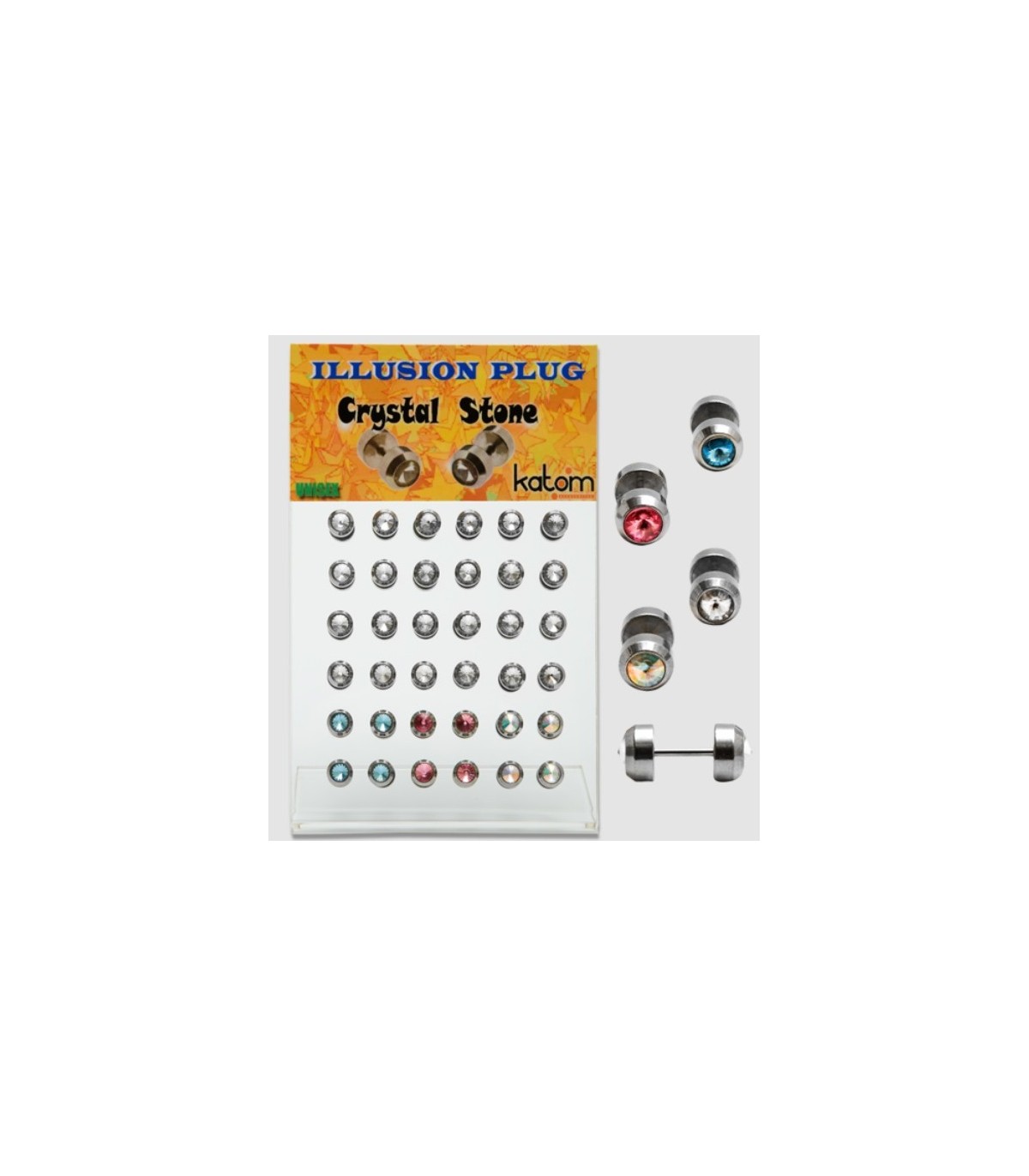 Exposant Fake Plugs 6, 8, 10mm. Matériel: acier et acier noir. Avec cristal dans le centre et petits cristaux autour.