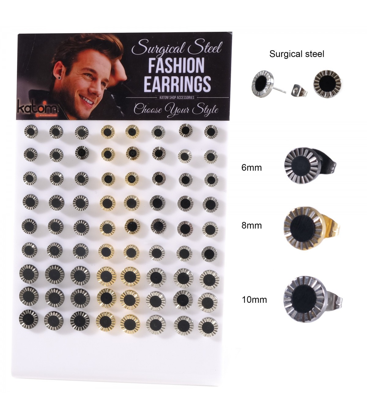 Présentoir de boucles d'oreille en acier chirurgical avec bord sculpté et centre de paillettes.Deux tailles: 8 et 10mm(Nombre de pièces: 72)