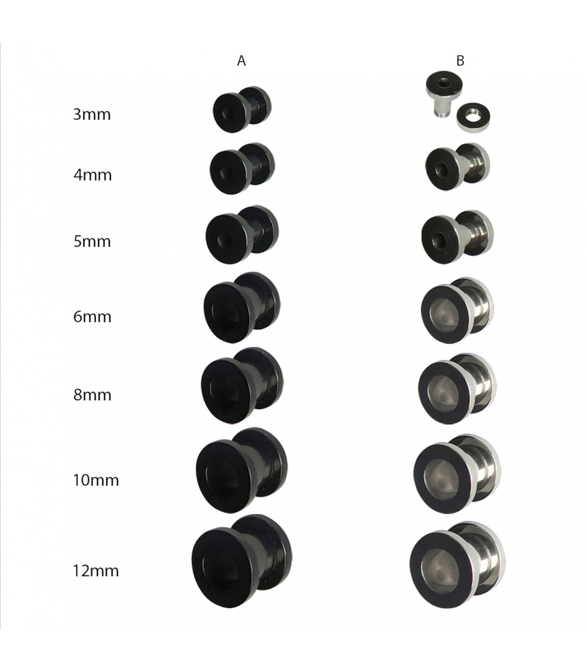 Pièces exposant 40 en acier avec caoutchouc arrière expansion. Mesure 3mm, 4mm, 5mm, 6mm, 8mm et 10 mm. Acier avec caoutchouc unisexe en retour. Il est disponible en couleur noir acier et plaqué acier partenaires....