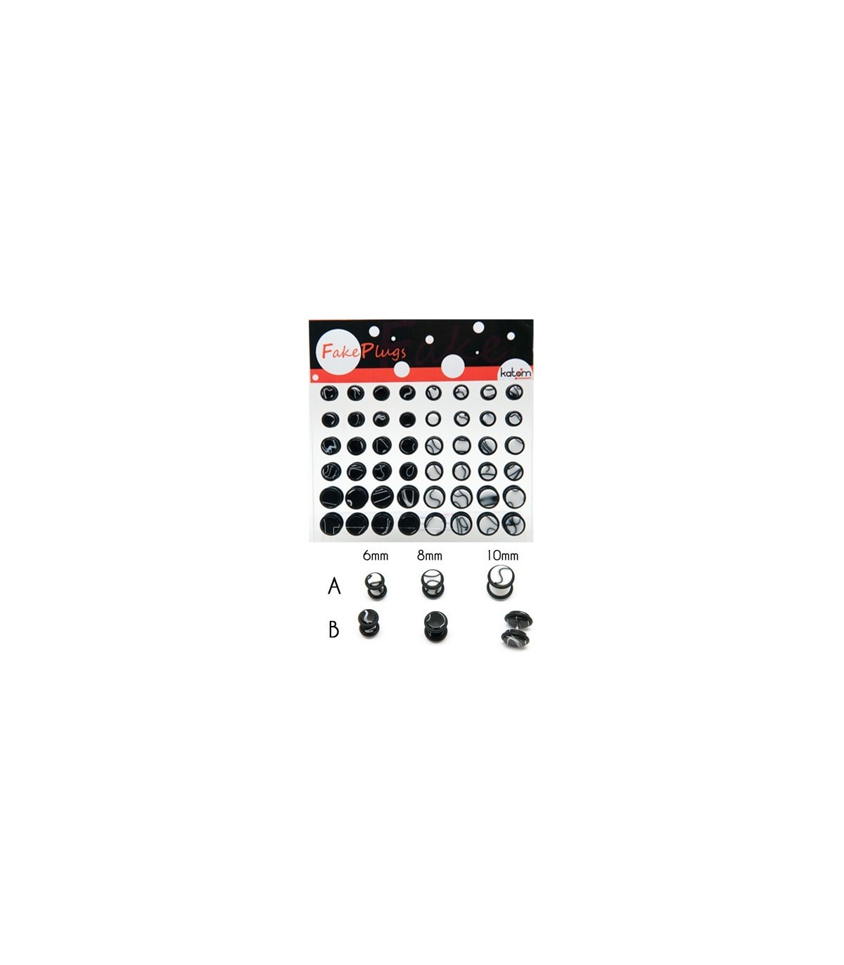 Exposant Fake Plugs avec des dessins tribaux. Matériel: Acrylique. 8 dessins différents. Blanc et noir. Tailles: 8mm, 10mm, 12mm