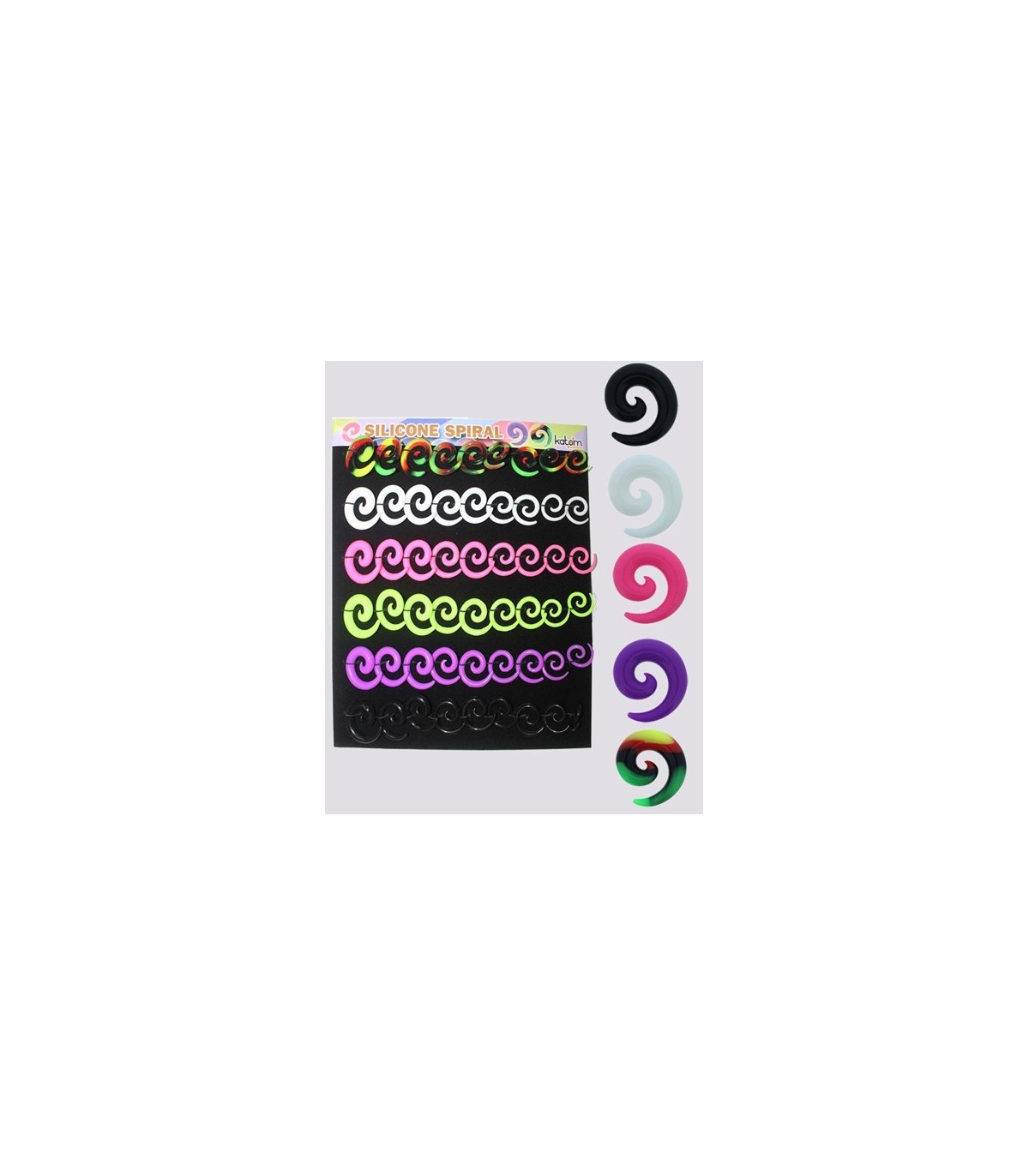 Dilatateurs exposant formes spirale de mesures 3, 4, 5, 6, 8, couple de silicone de 10mm de toutes tailles et de couleurs. (Nombre de pièces : 36)