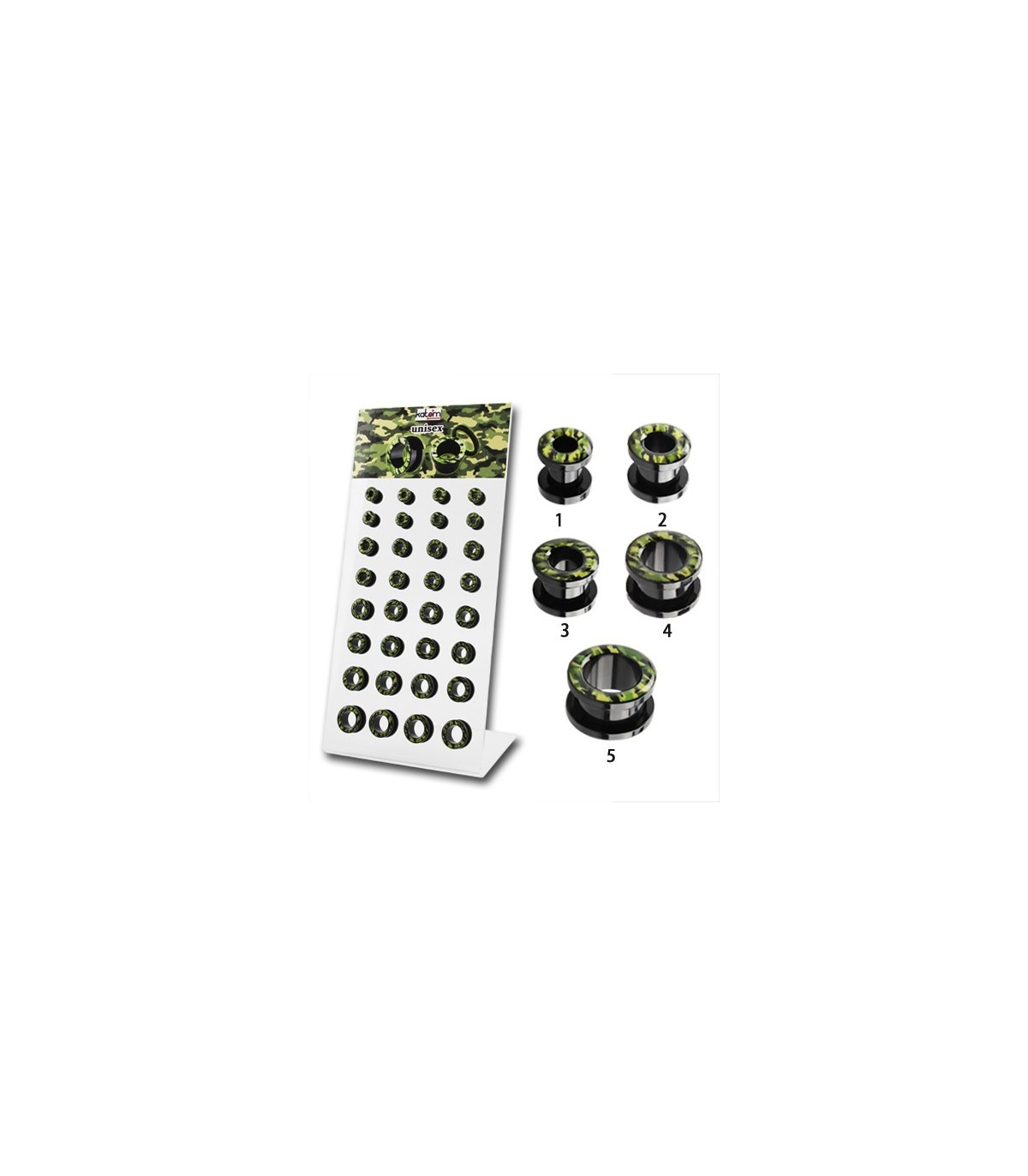 Exposant dilatations de l'oreille avec filetage intérieur. Type de tube. Design camouflage. Matériau acrylique. Dans 4 tailles différentes: 6mm, 8mm, 10mm, 12mm.
